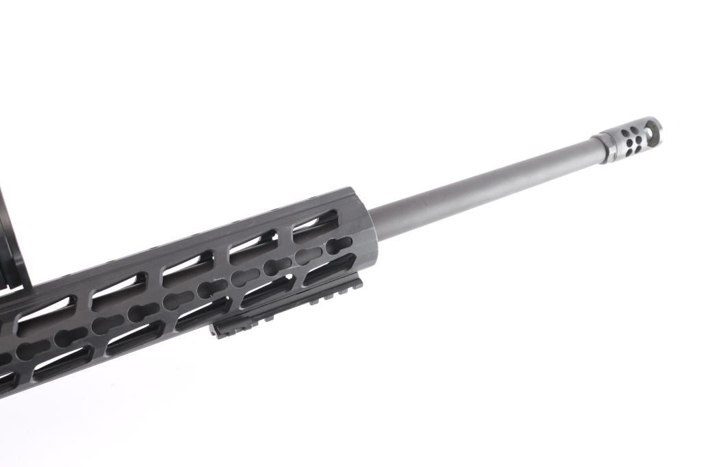 Magazine fed bolt action target rifle. Features matte black finish, heavy contour 24” barrel with ported muzzle break, three-lug bolt with 70 degree throw & oversized knob, Marksman Adjustable trigger, accepts detachable magazines, one 10 rd magazine provided, manual safety, Ruger 15” aluminum free-float key-mod handguard added quick detach swivel socket added, Picatinny rail section attached to handguard at 6 o'clock position, AR style Ergo pistol grip, Ruger left-side folding shoulder stock with fully adjustable Ruger butt stock on AR style tube. Bore is bright, appears very good, needs cleaning. Retains 95% finish with handling marks. Mounts a Steiner T5Xi 3-15x50mm scope, illuminated SCR reticle (not tested - battery not present), Steiner rings, extended sun shade, excellent condition, clear view. Includes factory boxes for rifle and scope..