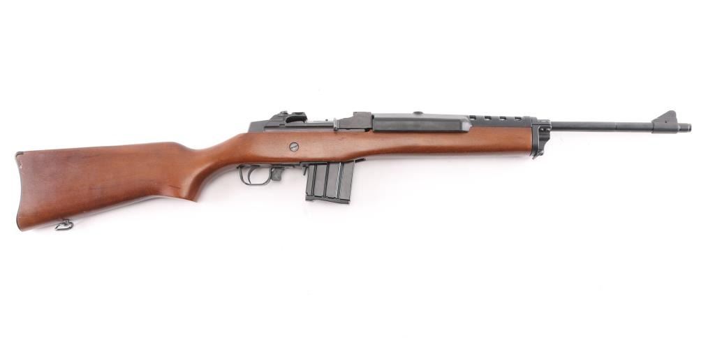 Semiautomatic rifle features blued finish, smooth wood stock, black polymer handguard, 18" threaded barrel, blade front sight, folding adjustable notch, flip rear sight, manual safety, sling swivels, plastic butt plate, dovetail scallop cuts on top of receiver for optics. Bolt stop button on left receiver rail. Bore is excellent/bright Retains 98% blued finish with handling marks. Stock is near excellent with few scratches. Includes (1) Ruger 5 round magazine.