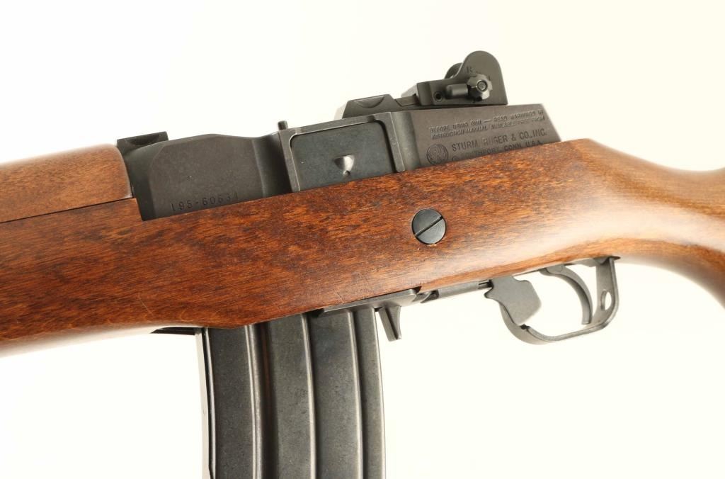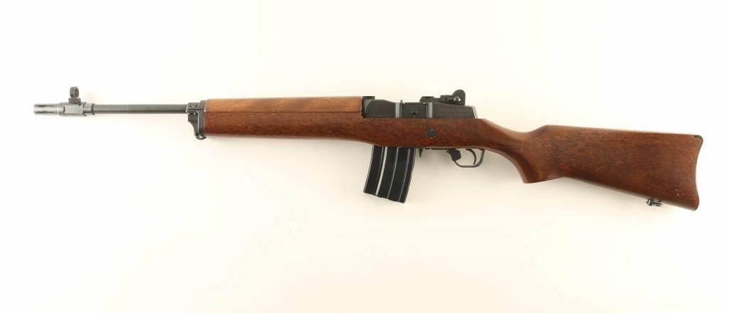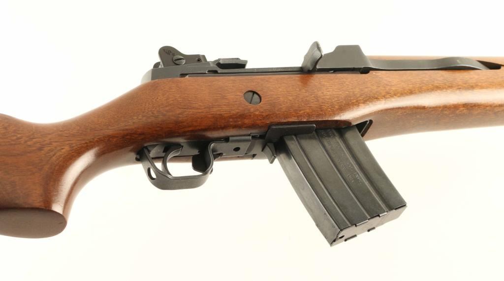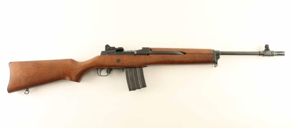 Semiautomatic rifle features blued finish, wood stock & handguard, 18" barrel, blade front sight with protective ring, adjustable peep rear sight, manual safety, sling swivels, flash hider, dovetails in receiver. Bore is very good condition. Retains 95% blued finish with signs of handling and use, some bare metal on sharp edges and where bolt rubs, small area of cleaned patina at flash hider. Stock is very good or better condition with dents & scratches. Includes (1) good condition 20 round magazine. Condition is NRA Very Good+ *** Modern Firearm ***