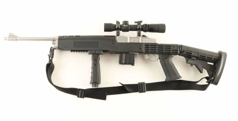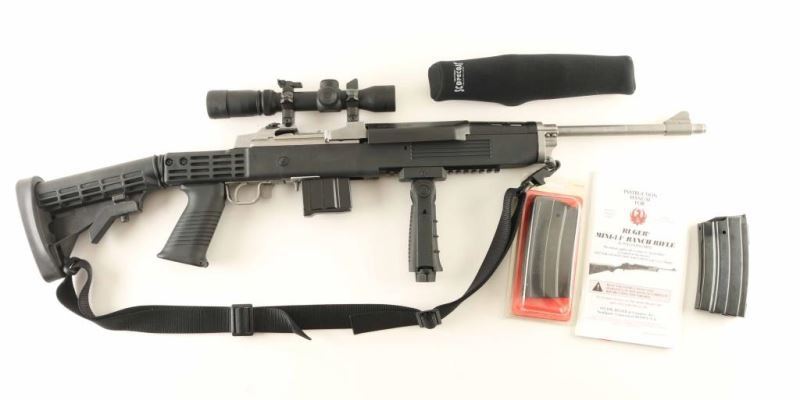 Semiautomatic rifle features stainless construction, Tapco black nylon stock with pistol grip & matching handguard, folding front grip attached to accessory rail on bottom of forend, front blade sight, adjustable rear folding peep sight, last round bolt hold open, manual safety, sling swivels. Mounts a Burris 2-7x scope using the receiver dovetails, with rings that include auxiliary ironsights. View thru scope is clear and bright, showing a duplex reticle. Bore is excellent condition. Overall condition is excellent with few signs of handling. Includes (1) 10 round aftermarket and (2) 20 round Ruger magazines, black nylon sling. Condition is NRA Excellent *** Modern Firearm ***