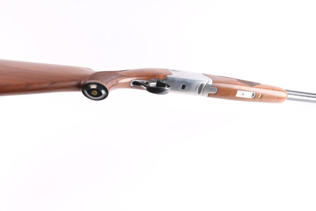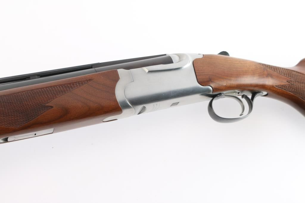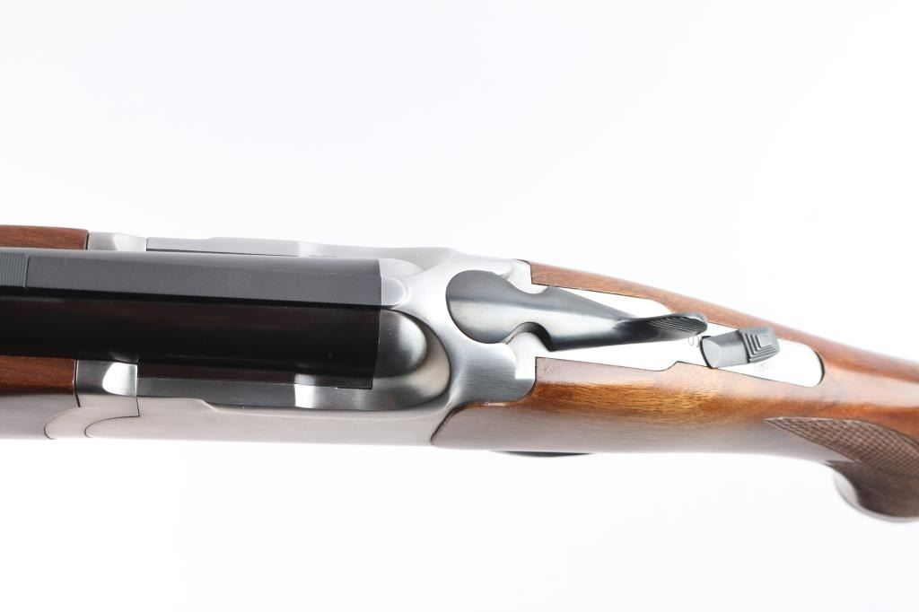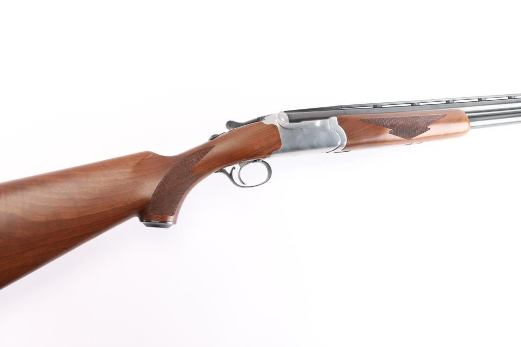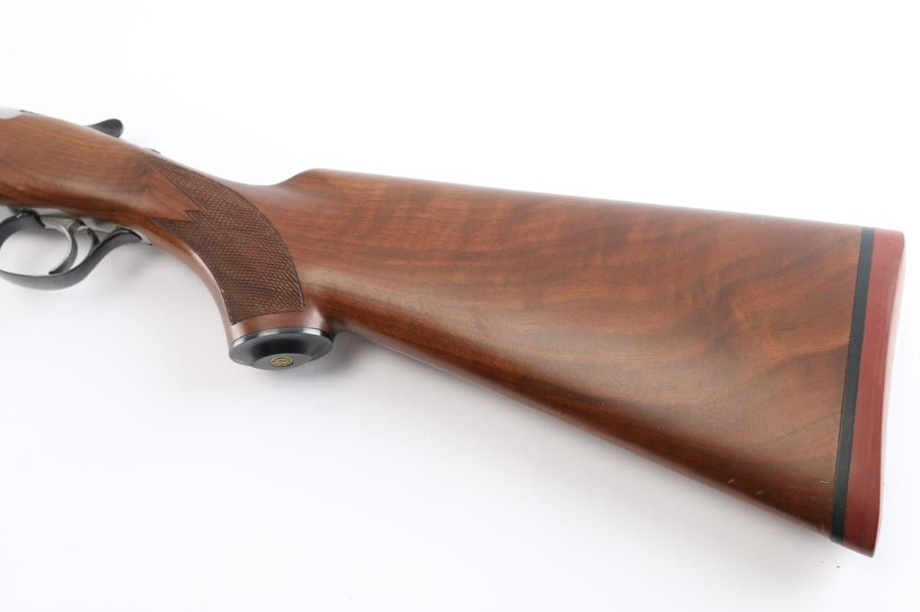Over-Under shotgun features blued 26" vent rib barrels, stainless steel receiver, checkered wood forend, curved grip stock with checkered wrist panels, solid rubber factory butt pad, steel grip cap with Ruger medallion, single trigger, tang safety selects barrel, selective auto ejection, brass front bead. Accepts up to 3" shells. Choke tubes installed (Mod over IM). Barrels and other blued parts retain about 97% finish with some minor scratches. Bores are excellent/bright. Action is near excellent condition with small scratches. Wood is excellent. Approx stock measurements: 14 1/4" Length of Pull, 1-3/4" Drop at Comb, 2-5/8" Drop at Heel. Manufactured 1991.