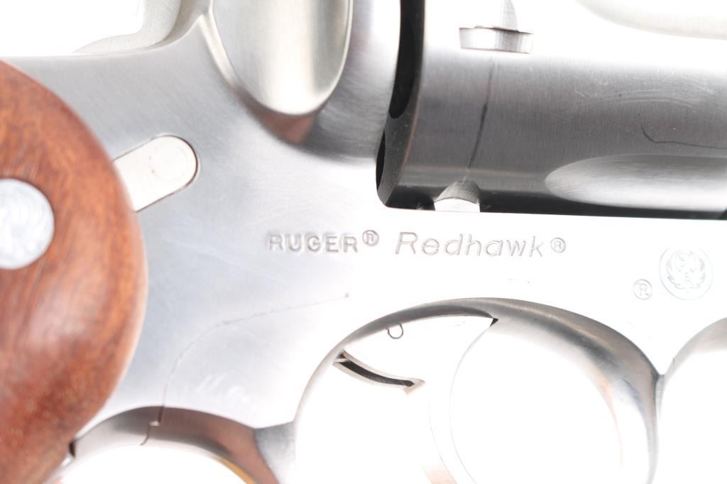 Large frame double-action six shot revolver chambered in .44 Magnum, circa 2000. Features a satin stainless finish, 7 1/2" barrel with serrated sighting rib, dovetailed serrated ramp front sight with orange insert, adjustable white square notch rear sight, smooth trigger, knurled hammer spur, transfer bar safety, fluted six-shot cylinder, shrouded ejector rod, and smooth brown wood grips with Ruger medallions. Bore is bright with strong rifling. Retains approx. 98% finish with no marks. Action is smooth with solid lock-up. Grips are very good.NRA Condition is excellent. ***Modern Firearm***