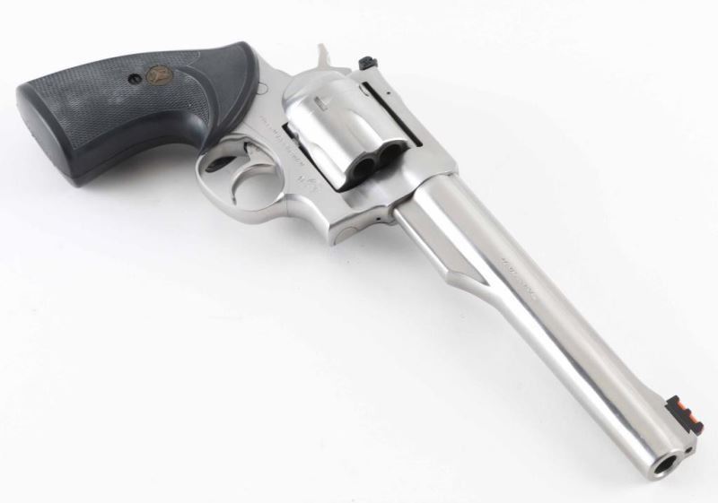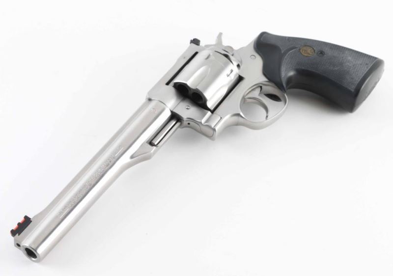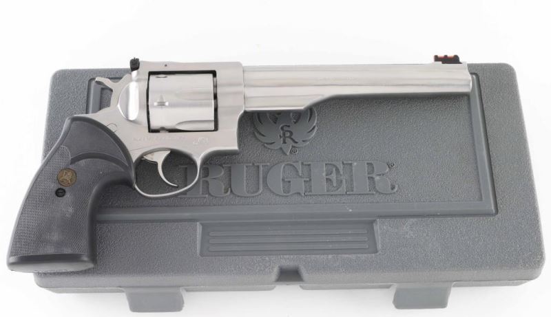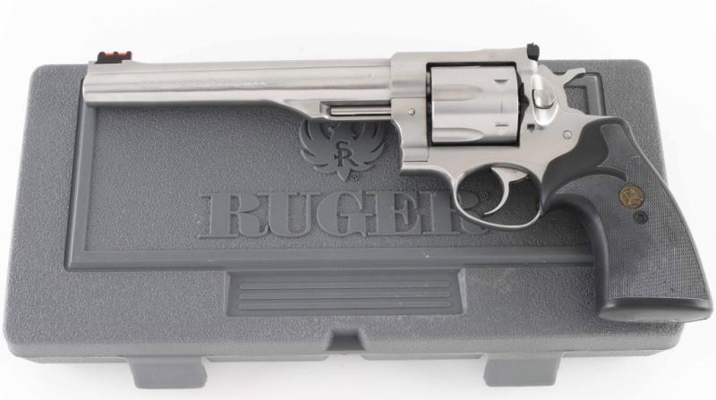 *** Needs Repair *** Double/single action revolver features stainless steel construction, 7.5" barrel, adjustable sights with fiber optic insert front and white outline rear, 6 shot swing-out cylinder, black checkered rubber Pachmayr grips. Bore is very good condition, needs cleaning. Metal finish is excellent condition satin stainless with a few small shiny spots from handling. Grips are excellent. Action feels a bit mushy, hammer does not always pick up in double action operation, needs repair. Includes gray plastic Ruger storage case, spare set of sights. Condition is NRA Poor - Needs Action Repair *** Modern Firearm ***