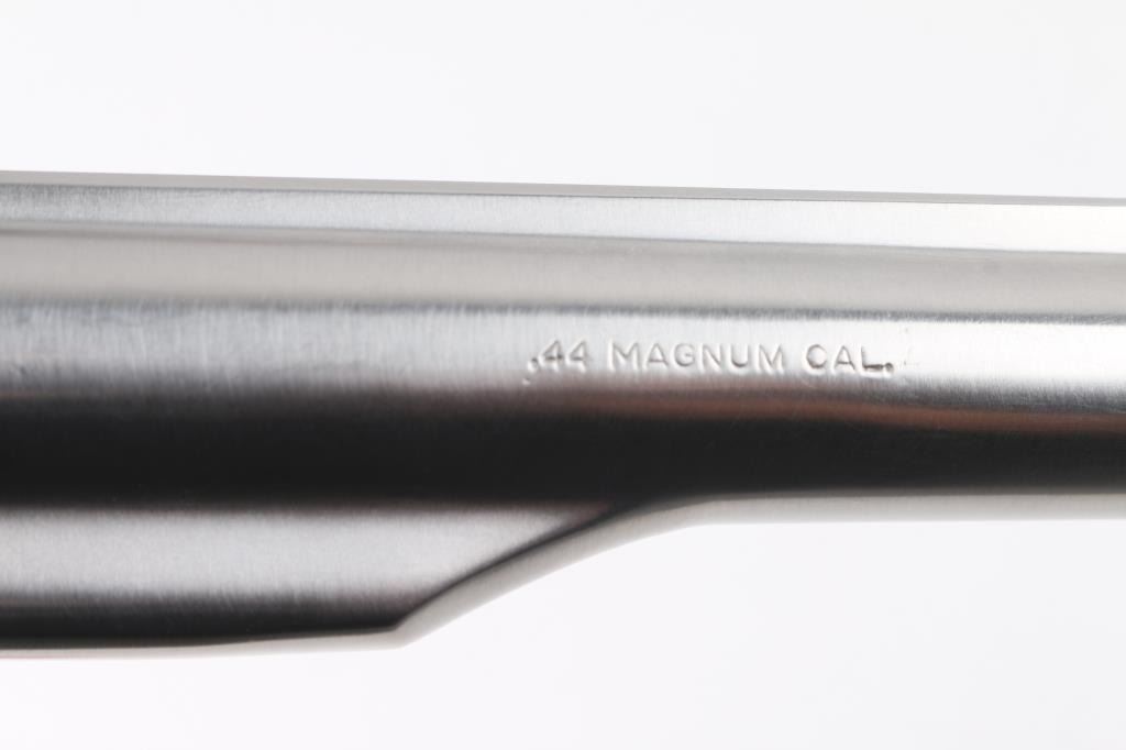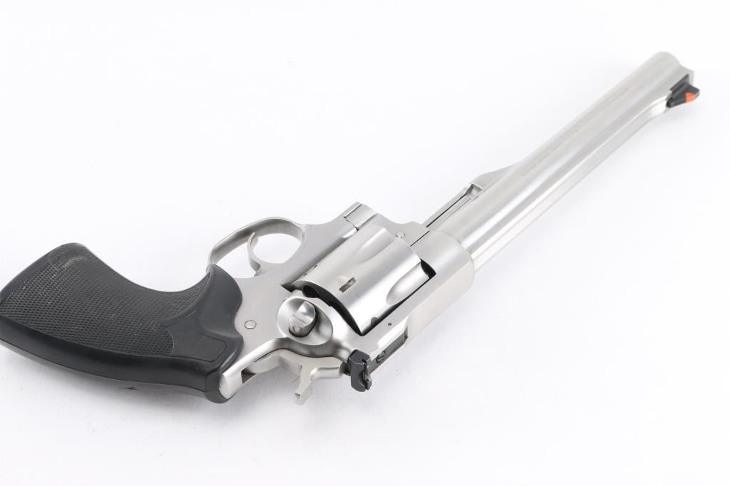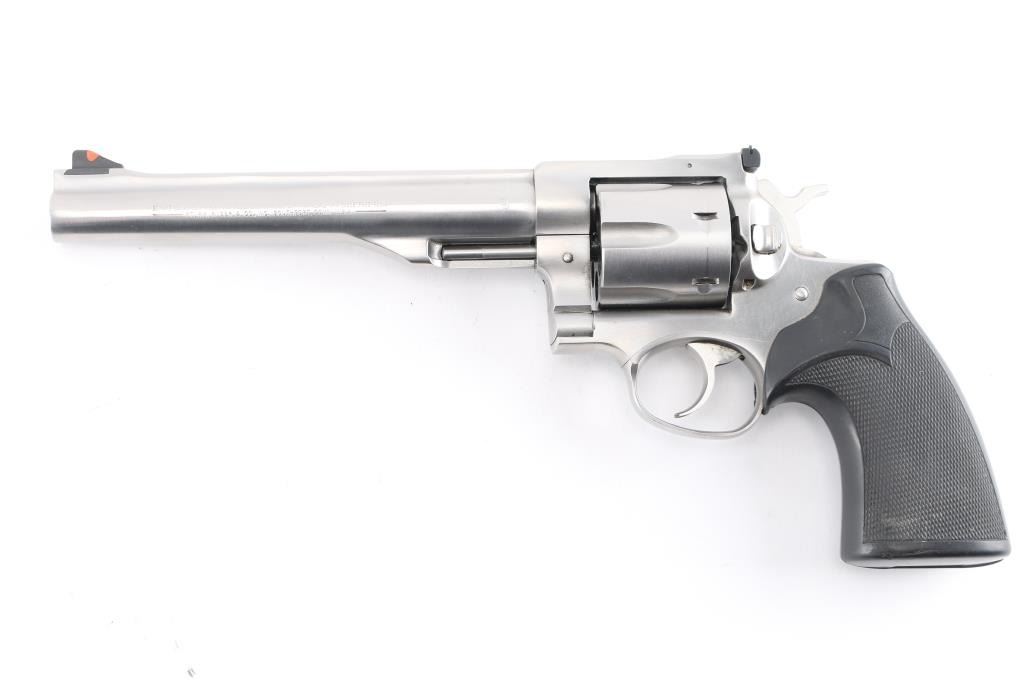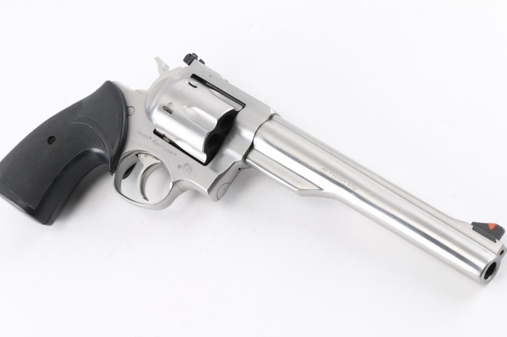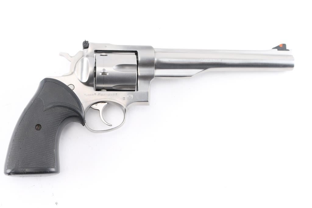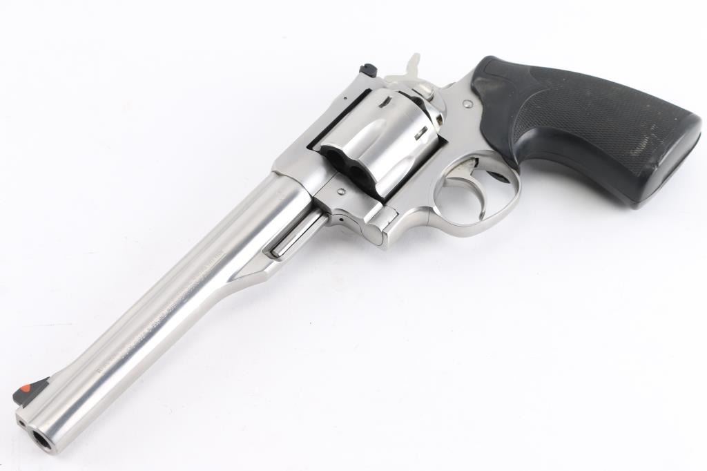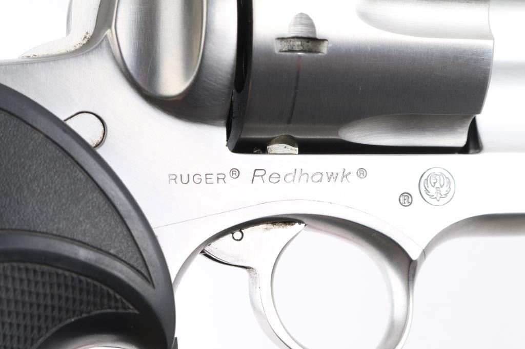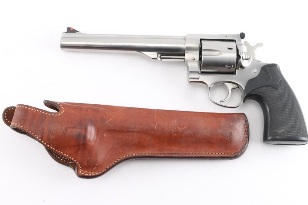 Double action revolver chambered for 44 Magnum. Features stainless steel construction, 7.5" barrel, adjustable sights with orange insert ramp front and white outline rear, fluted 6 shot cylinder, textured black rubber Pachmayr grips. Bore is excellent/bright. Metal finish is excellent condition with a few very minor scratches. Grips are excellent. Action operates smoothly and locks up tight. Comes with brown leather Bianchi Ruger Redhawk holster, very good condition.