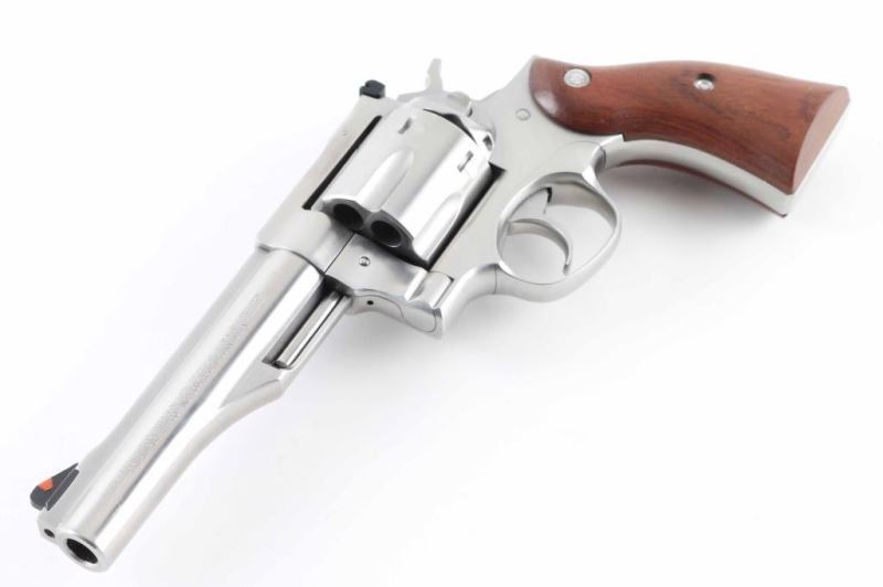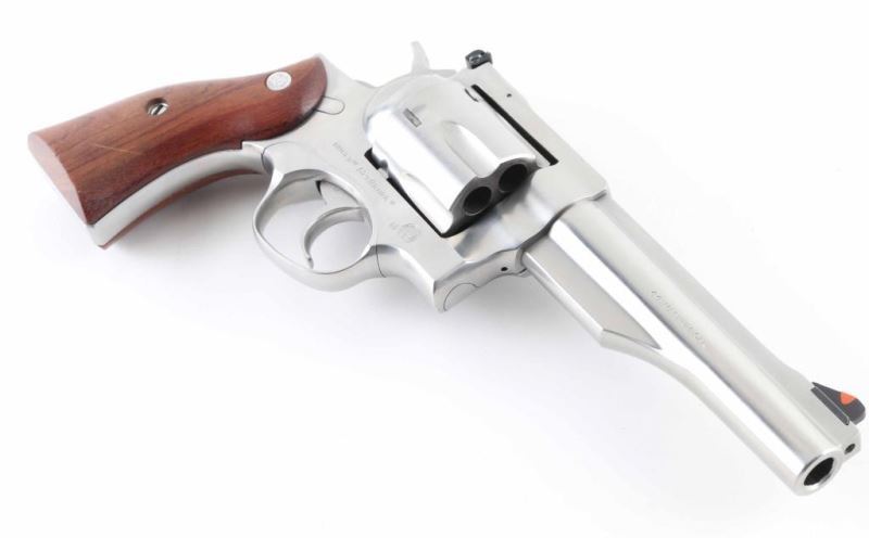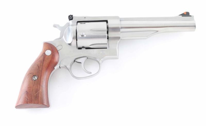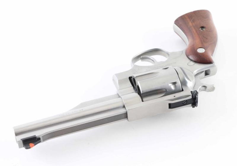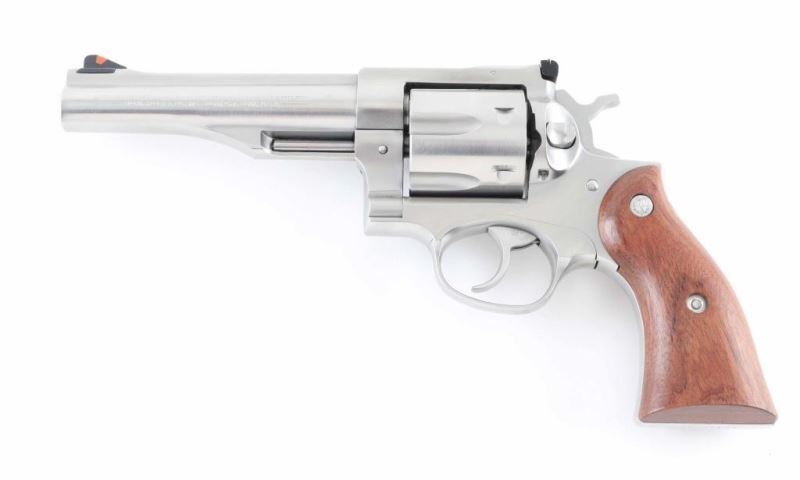 This double/single action revolver chambered for 44 Magnum, features stainless steel construction, 7-3/8" barrel, adjustable sights with red ramp front and white outline rear, 6 shot swing-out cylinder, smooth wood grips with Ruger medallions. Bore is excellent. Metal finish is excellent condition satin stainless with minor signs of handling. Grips are excellent. Action operates smoothly and locks up tight. Condition is NRA Excellent Modern Firearm