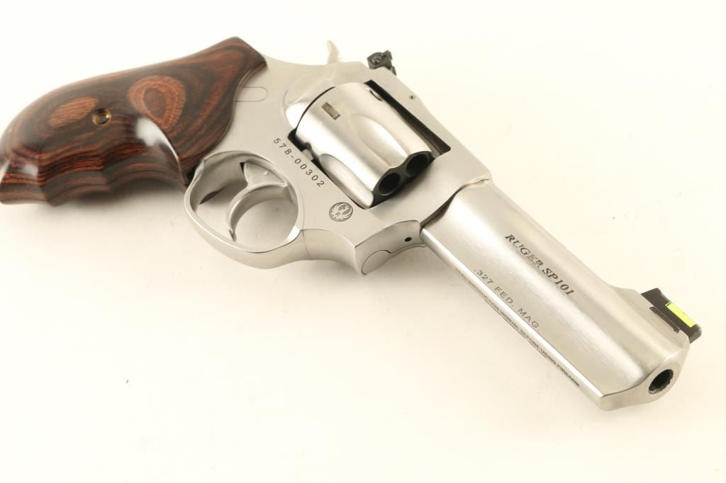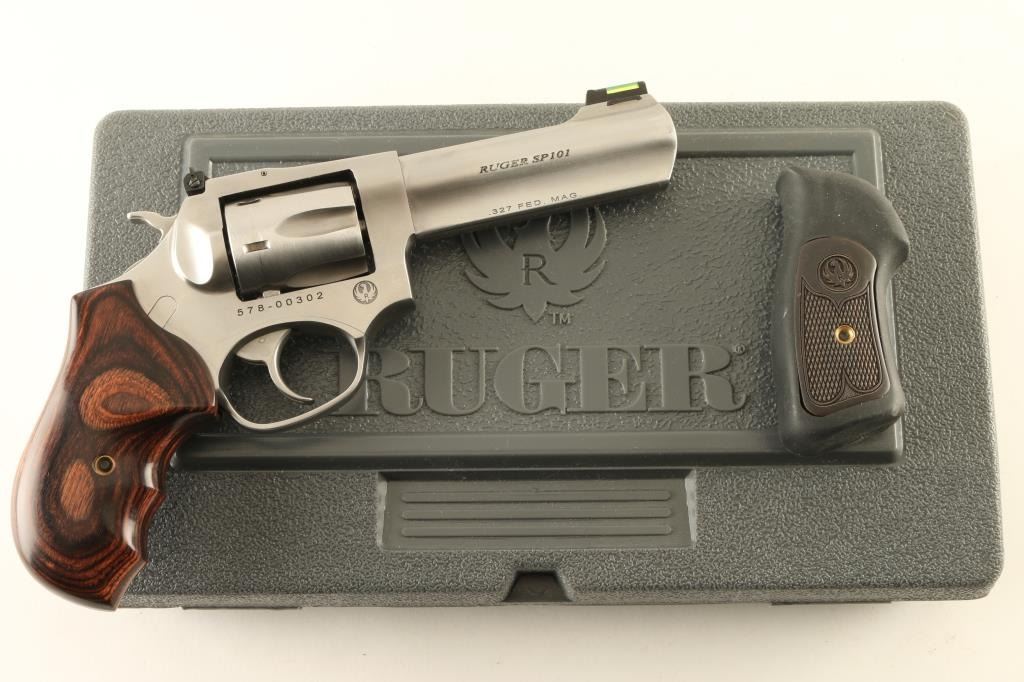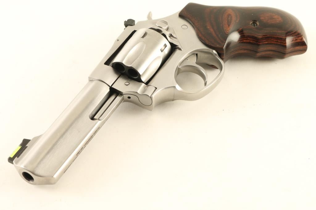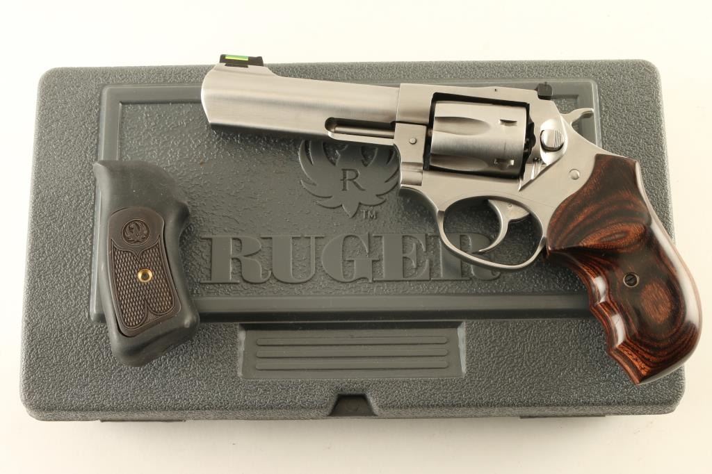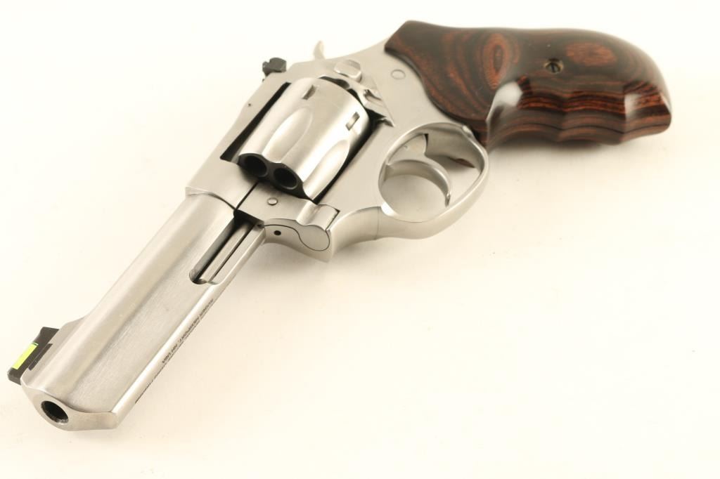 Double/Single action revolver features stainless steel construction, 4.25" barrel with full length underlug, adjustable sights with fiber optic insert front sight, six shot swing out cylinder, two piece wrap-around wood grip with finger grooves. Bore and chambers are excellent condition. Overall condition is like new, with few signs of handling. Includes original factory hard plastic box with manual, original factory grips, small assortment of ammunition, reloading dies and reloading components useable with this revolver. Condition is NRA Excellent *** Modern Firearm ***