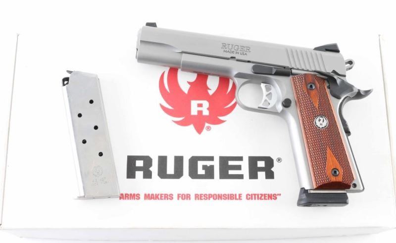 Pistol. Semi-Automatic. 8+1 capacity. Manufactured in Prescott, Arizona, and so marked on the right frame. 5" barrel with Drift adjustable Novak 3 dot sights. Low glare Stainless steel slide, and stainless frame. Skeletonized aluminum trigger. Skeletonized hammer. Oversized beavertail grip safety. Checkered mainspring housing. Checkered, diamond hardwood grips with Ruger medallions. Bore appears excellent/bright. Slide action is smooth/tight. Grips are excellent. Stainless metal finish is excellent. Comes in the original Ruger factory box with 2 8-rd magazines, manual, lock, and barrel bushing tool. Also included is a black nylon Ruger pistol case. NRA Condition-Excellent. Modern firearm.