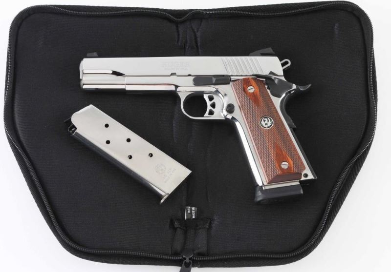 This is a modern 1911 from Ruger chambered in .45 ACP. It is stainless construction with a high polish, mirror finish and a 5" barrel. The bore looks good needs cleaned. It has hardwood grips and the black grip screws have been replaced with stainless. (the originals come with the gun) The gun has a skeletonized hammer and trigger, oversized beavertail grip safety, rear slide serrations and drift adjustable Novak 3 dot sights. It comes with one 7 round mag, one 8 round mag, soft case, owners manual and original box. NRA Excellent Modern Firearm