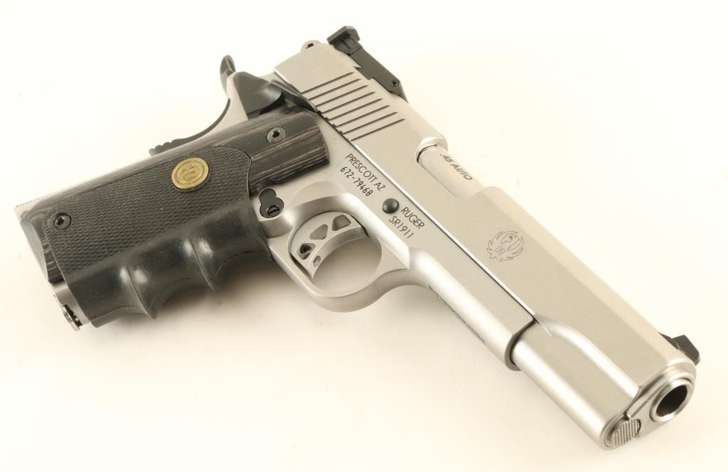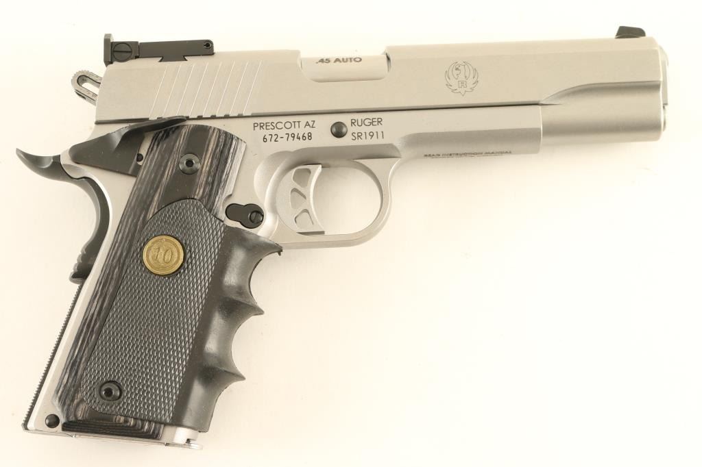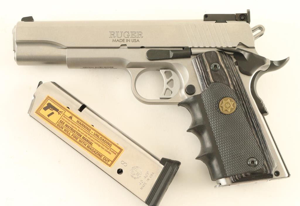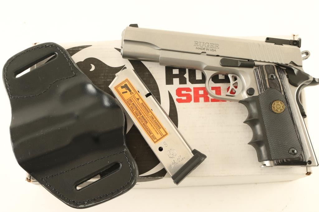 Semiautomatic pistol features stainless steel construction, laminated wood grips with rubber finger groove wrap-around insert, 5" barrel, adjustable target style sights, extended ambidextrous manual safety, beavertail grip safety. Overall condition is like new, with few handling marks. Includes spare magazine (2 mags total), factory white cardboard box, manual, black leather belt slide holster. Condition is NRA Excellent - like new *** Modern Firearm ***