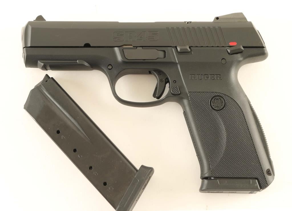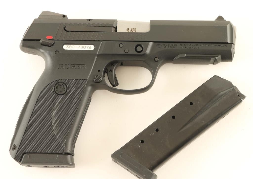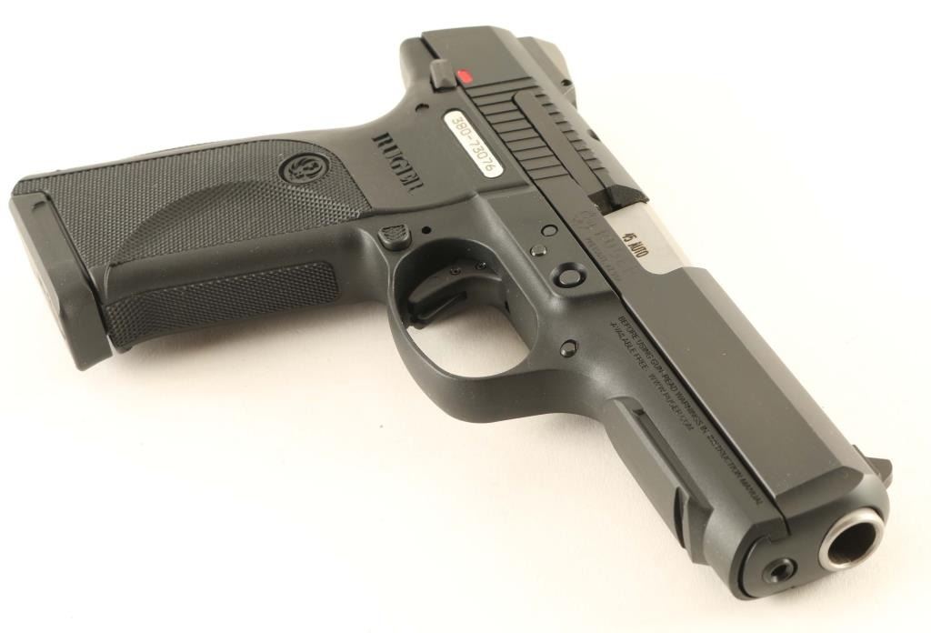 Semiautomatic pistol features 4.375" barrel, adjustable three dot sights, manual safety in trigger, loaded chamber indicator, striker status indicator, lanyard attachment point at butt, replaceable backstrap, ambidextrous manual safety. Finished in black alloy slide and black polymer frame. Bore is excellent condition. Overall external condition is like new, with little evidence of handling. Includes original factory cardboard box, manual, cable lock, two magazines. Condition is NRA excellent - Like New *** Modern Firearm ***