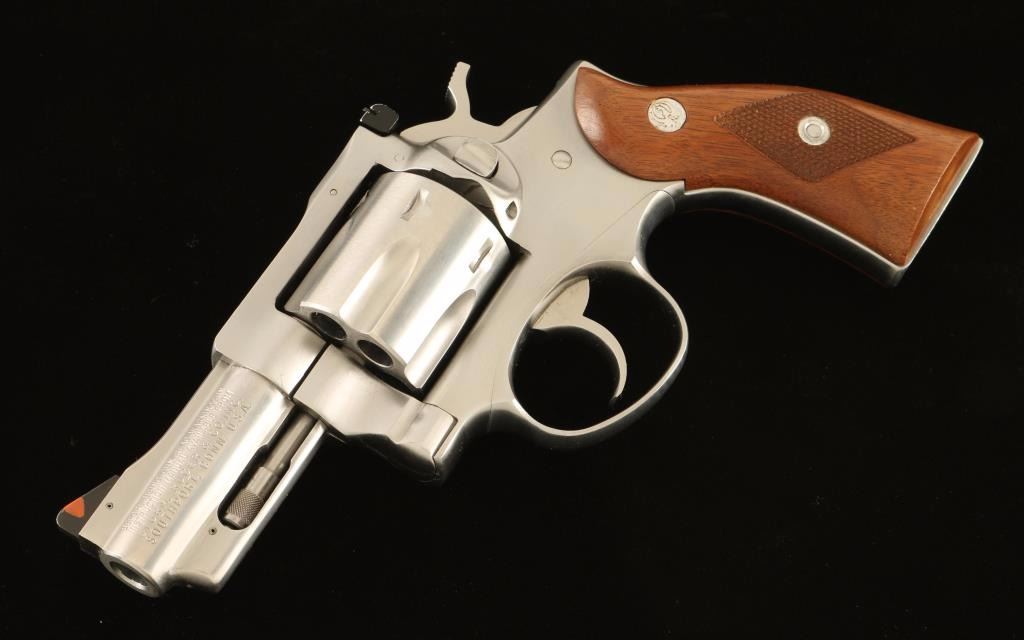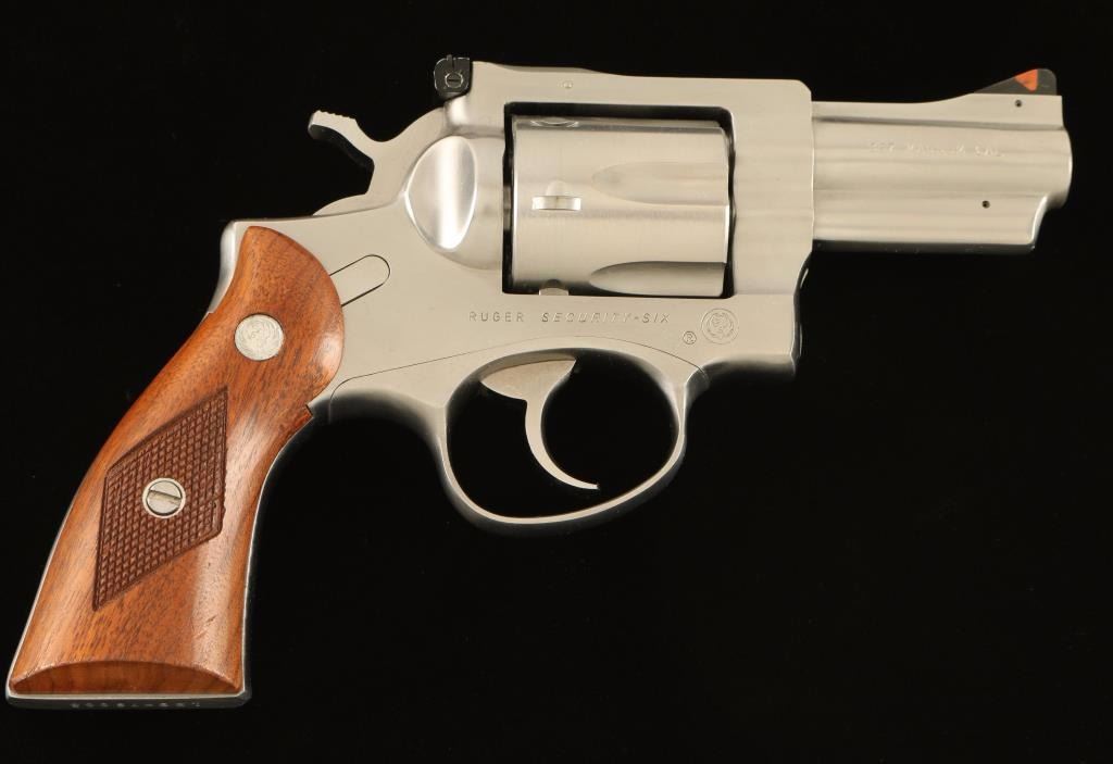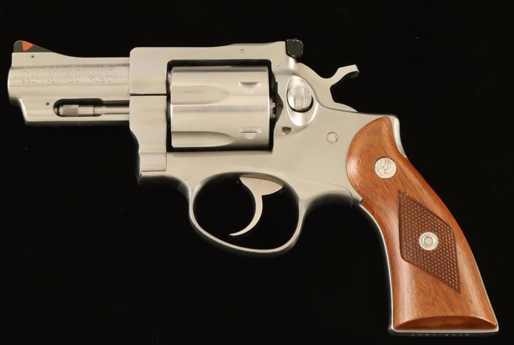 Medium frame stainless steel double-action revolver chambered in .357 Magnum, circa 1983. Features a brushed finish, solid ribbed 2 3/4" barrel, raised ramp front sight with orange insert, adjustable rear window sight, shrouded ejector rod, fluted six-shot cylinder, transfer bar safety, smooth trigger, checkered hammer spur and two-piece diamond checkered walnut grips with Ruger medallions. Revolver exhibits light muzzle wear, some minor handling marks and a faint drag line on the cylinder with no major wear observed. Action is smooth with solid lock-up, bore is excellent and wood grips are near fine. Condition is near excellent. ***Modern Firearm***