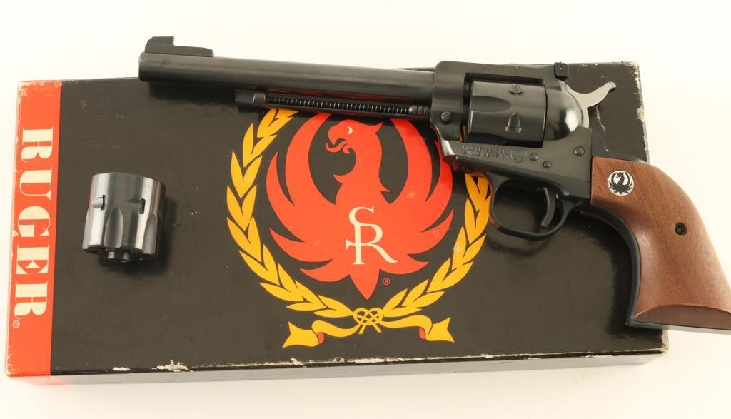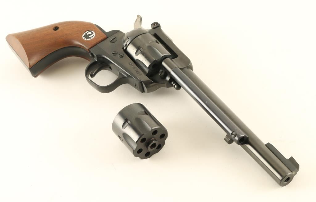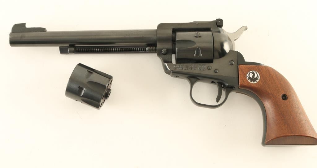 "Three Screw" Single Action revolver features blued finish, smooth wood grips with Ruger medallions, 6.5" barrel, adjustable sights. Bore is excellent. Overall condition is excellent with few signs of handling. Includes extra cylinder in 22 WMR (Magnum) in red cloth bag, original Ruger factory box. Condition is NRA Excellent *** Modern Firearm ***
