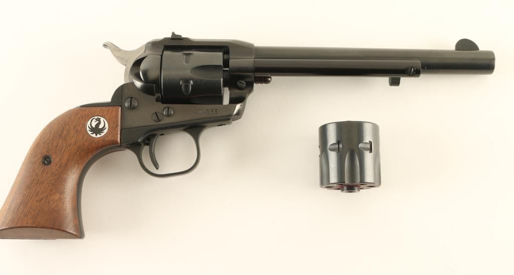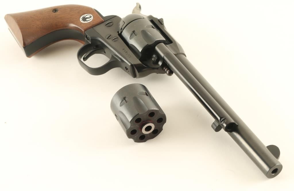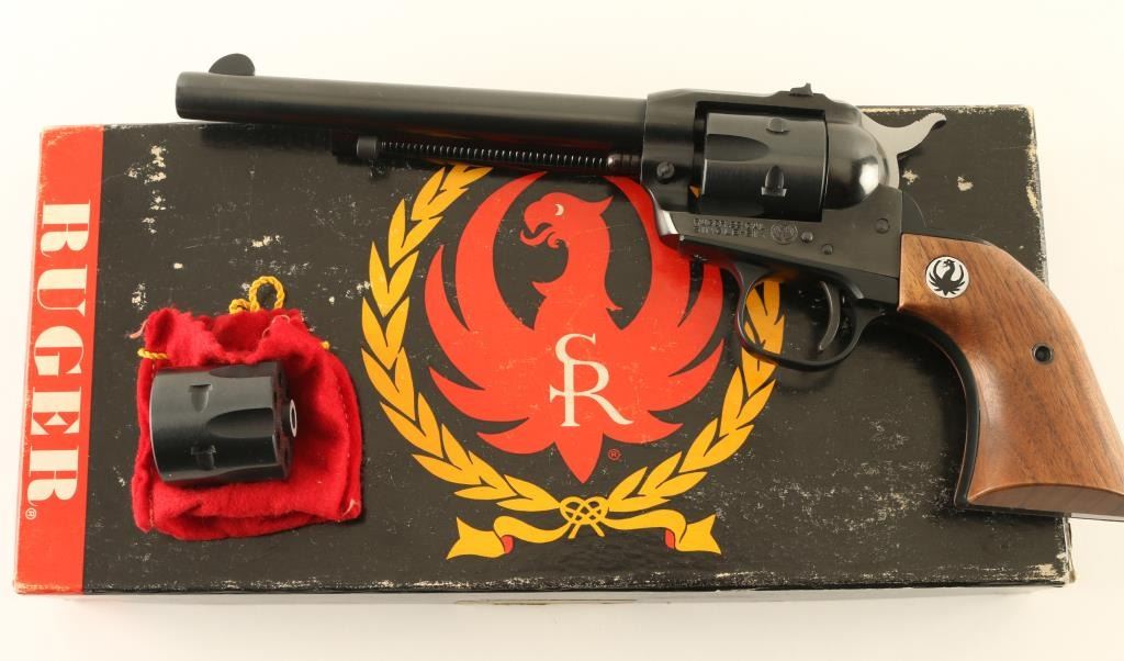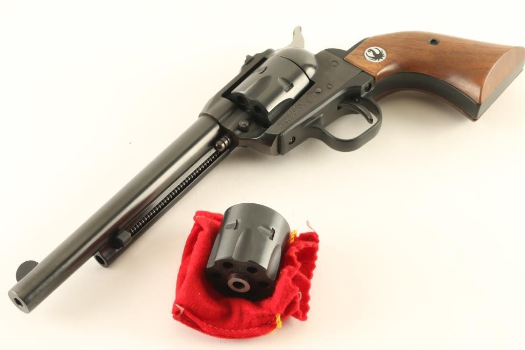 Single action rimfire revolver features blued finish, smooth wood grips with Ruger medallions, 6.5" barrel, fixed sights. Bore is excellent. Overall condition is like new with few signs of handling. Includes additional cylinder for 22 WMR (Magnum) in red cloth bag; older Ruger factory black cardboard box (with red end) for Single Six. Condition is NRA Excellent - Like New *** Modern Firearm ***