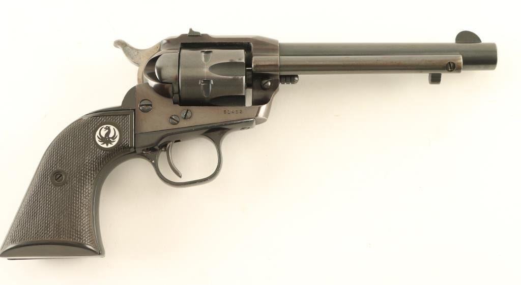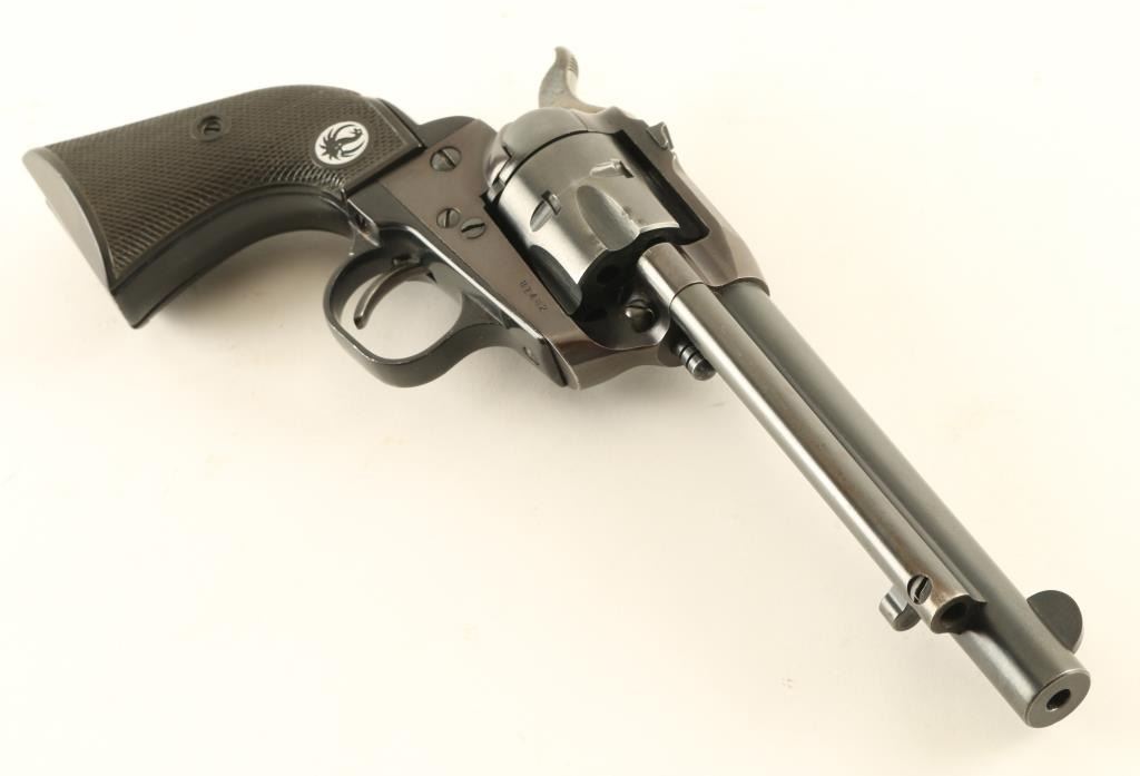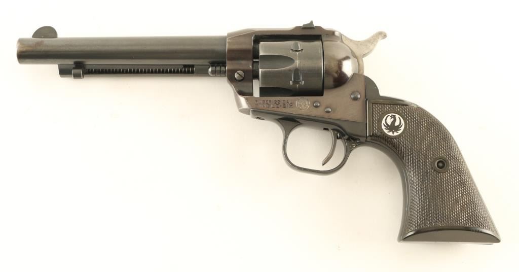 Single action rimfire revolver features blued finish, checkered black plastic grips with silver & black Ruger logo medallions, 5.5" barrel, fixed sights, ejector rod under barrel. Bore is very good condition. Retains 85% blue with some thinning or bare metal showing at muzzle, where barrel meets frame, sharp edges, cylinder drag line. Grips are very good. Condition is NRA Very Good *** Modern Firearm ***