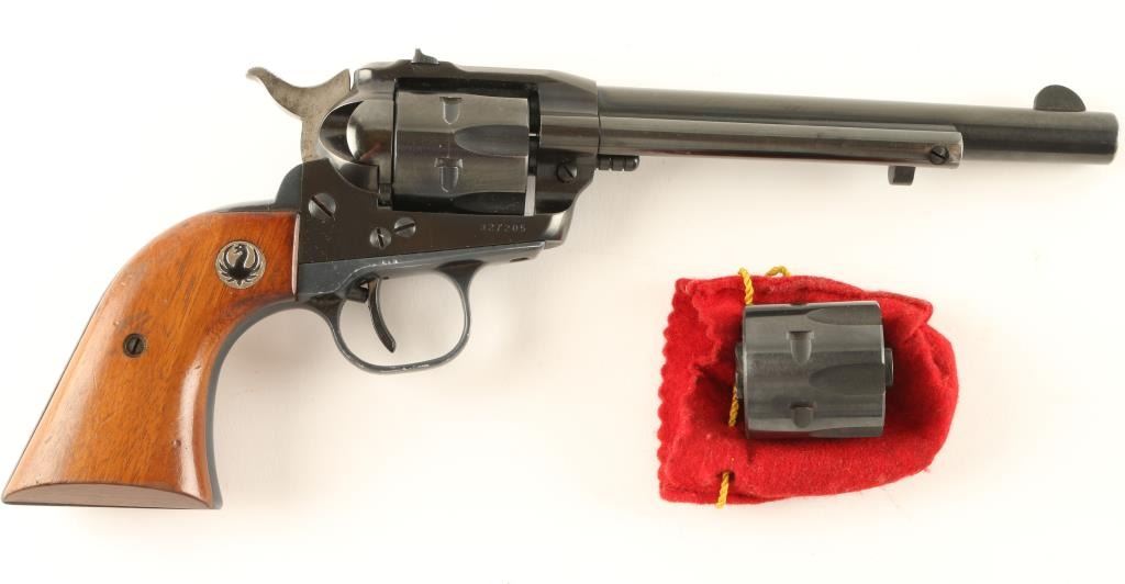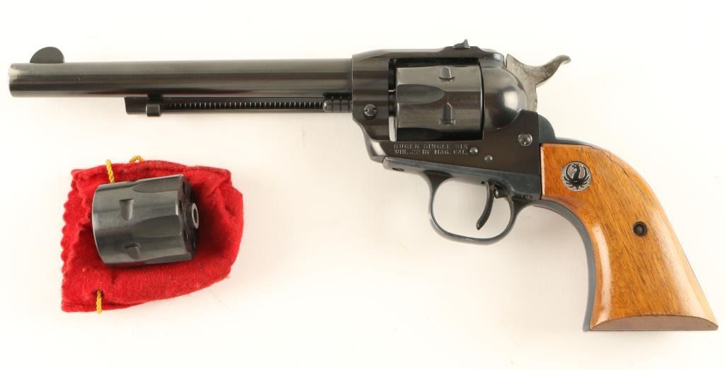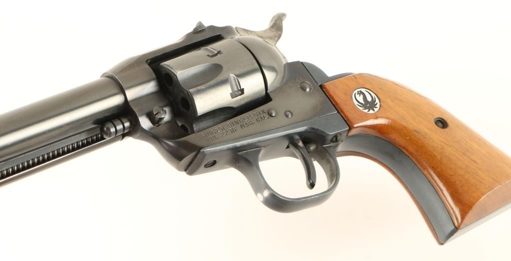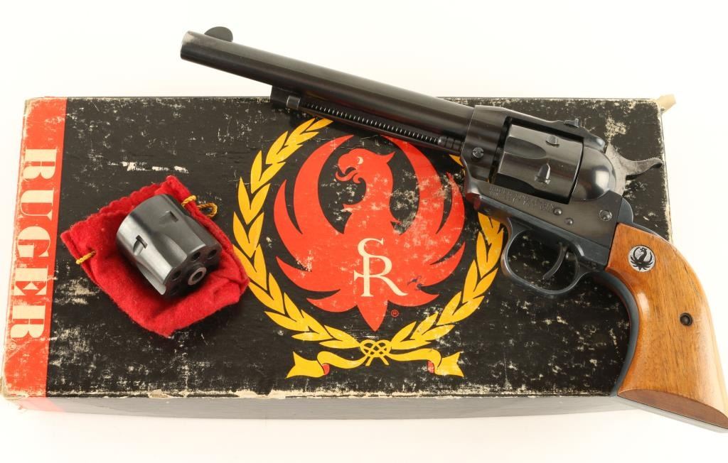Single action revolver chambered in .22 Magnum, circa 1961. Features a blued finish, 6.5" barrel, blade front sight, dovetailed rear window sight, fluted six shot cylinder, ejector rod, three-screw flat-top frame, no transfer bar safety, serrated hammer spur, and Ruger medallion smooth wood grips. Includes original factory box with .22 LR cylinder and documents. Revolver shows some muzzle wear, light wear on the grip frame and retains approximately 90% original finish. Action is crisp, bore is pristine, and grips are good with few minor blemishes & a deep scratch on the left panel. Condition is very good+ in box. ***C&R Firearm*** ***Modern Firearm***