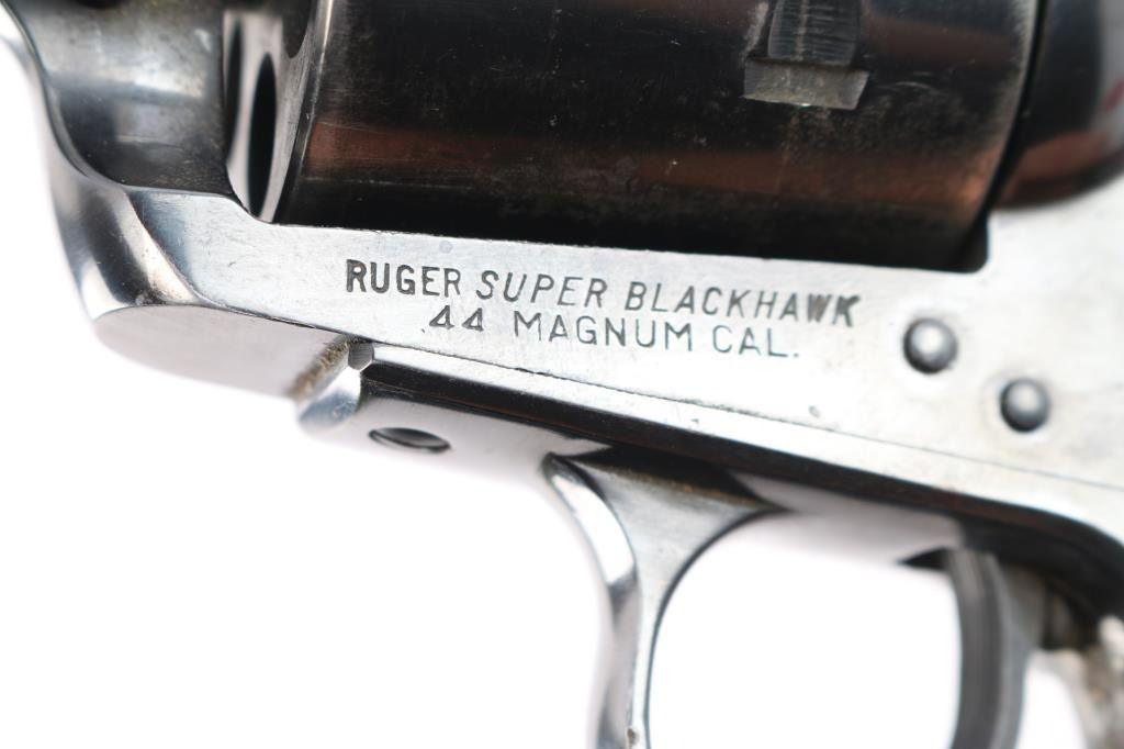 Single-action revolver manufactured circa 1971. Features blued finish, 7 1/2" barrel, serrated ramp front sight, pinned and adjustable square notch rear sight, non-fluted 6 shot cylinder, serrated hammer spur and serrated wide trigger. Bore is bright with strong rifling. Two piece wood grips with Ruger medallions have handling loss to the finish, some minor chips at the bottom of the panels. Retains approx. 75% finish with scratches, finish loss from holster/handling wear. Action is smooth. Come with a vintage Eubanks, Boise, Idaho basket weave snap holster and 19 loop brown leather cartridge belt