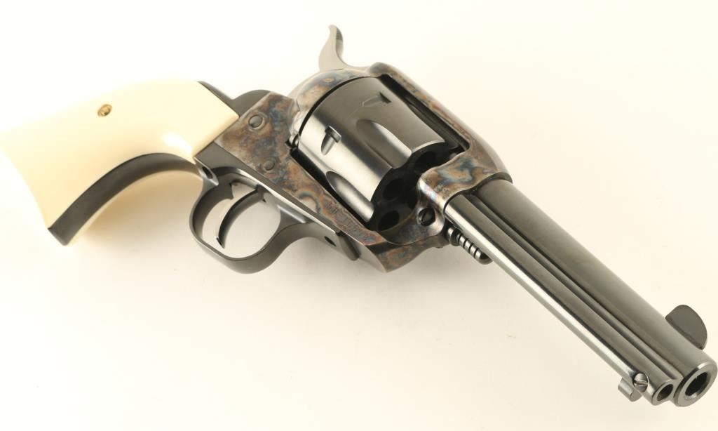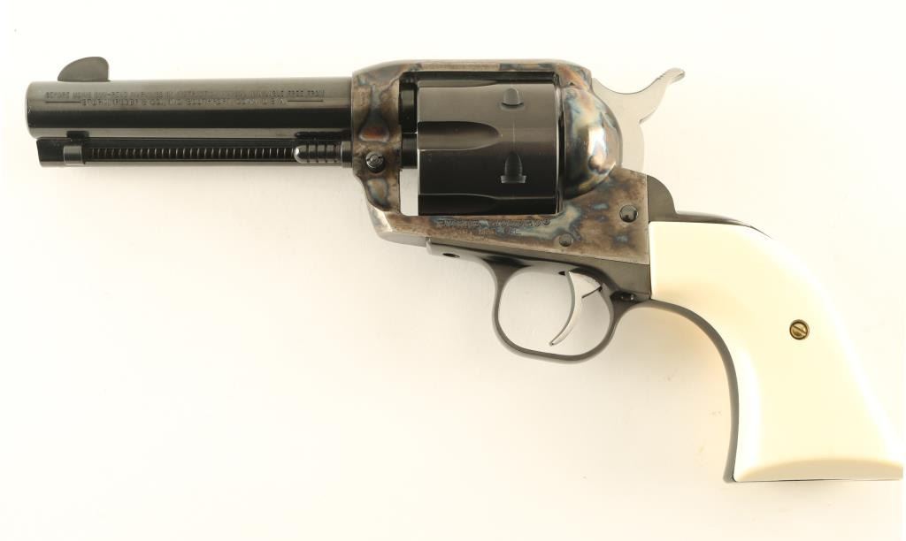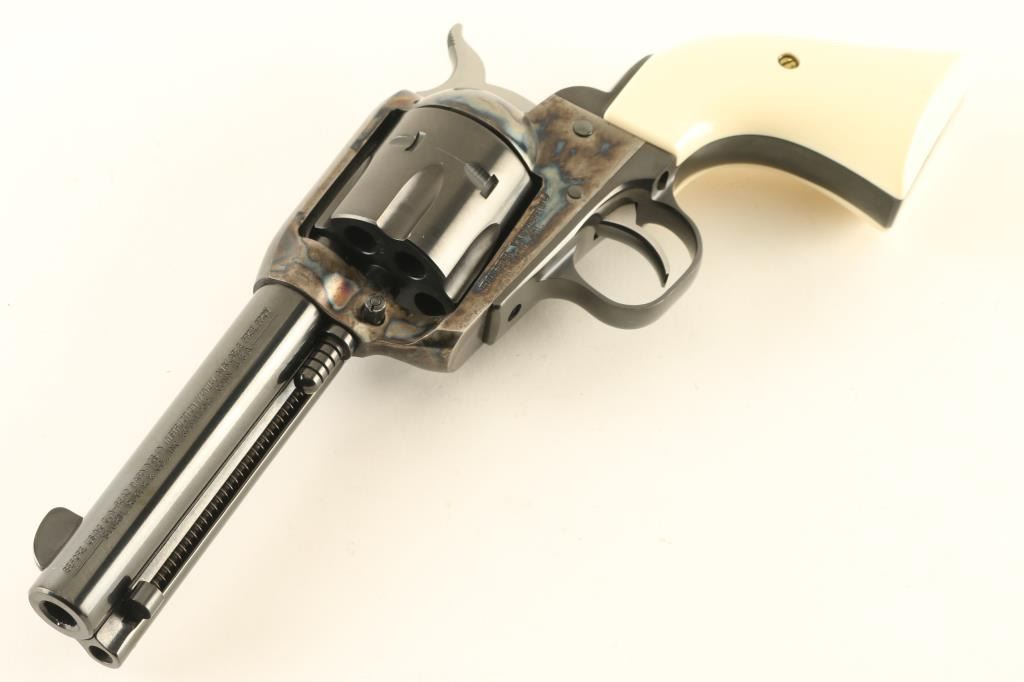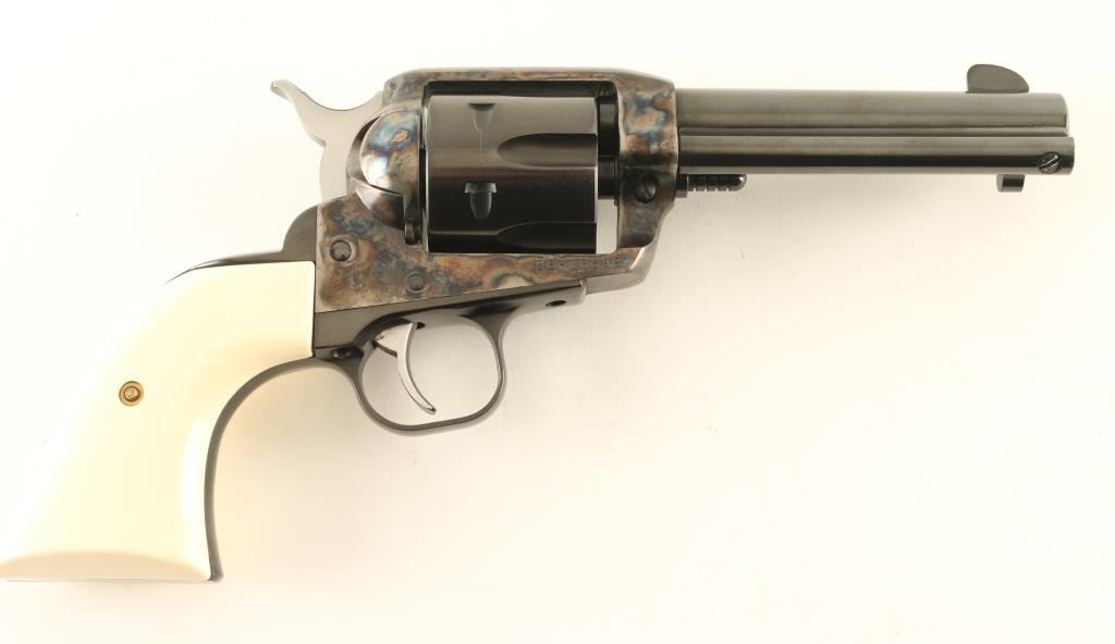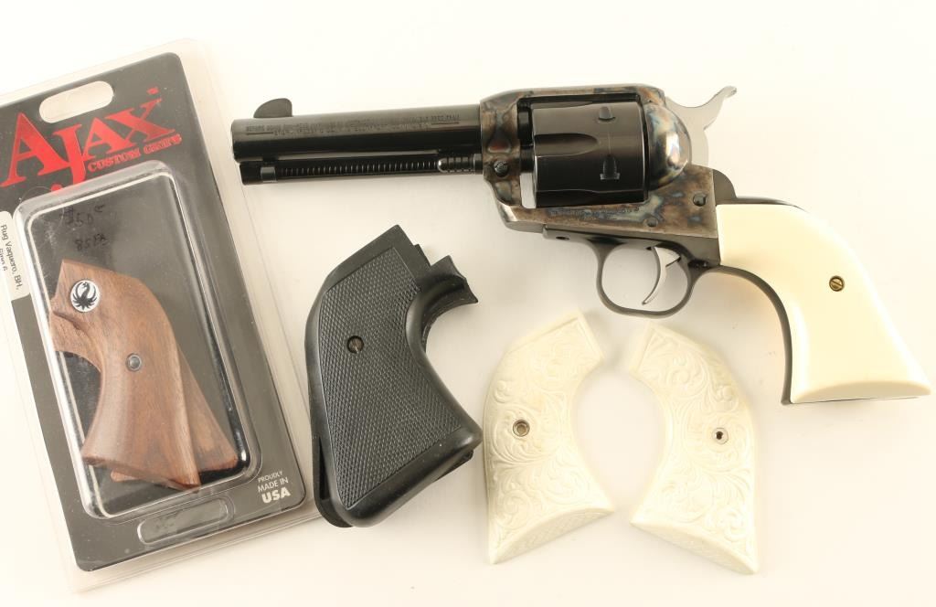 Single action revolver features blued finish, case color frame and loading gate, faux ivory polymer grips, 4.75" barrel, fixed sights. Bore is excellent. Overall condition is like new with few signs of handling. Includes (3) extra sets of grips: original factory wood with Ruger medallions, Uncle Mike's checkered black rubber, off-white polymer with embossed floral scrolls. Condition is NRA Excellent - like new *** Modern Firearm ***