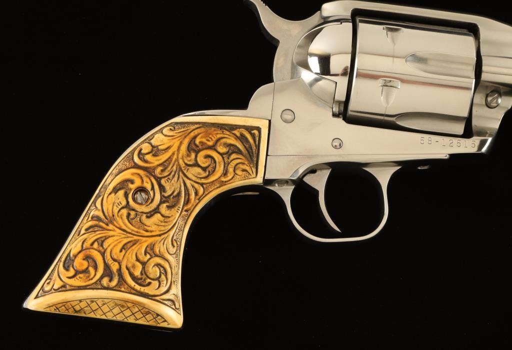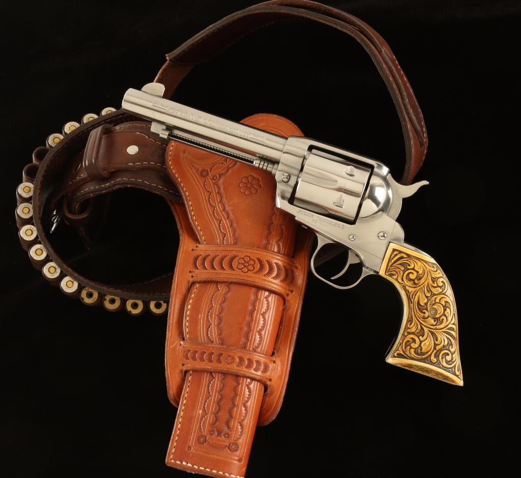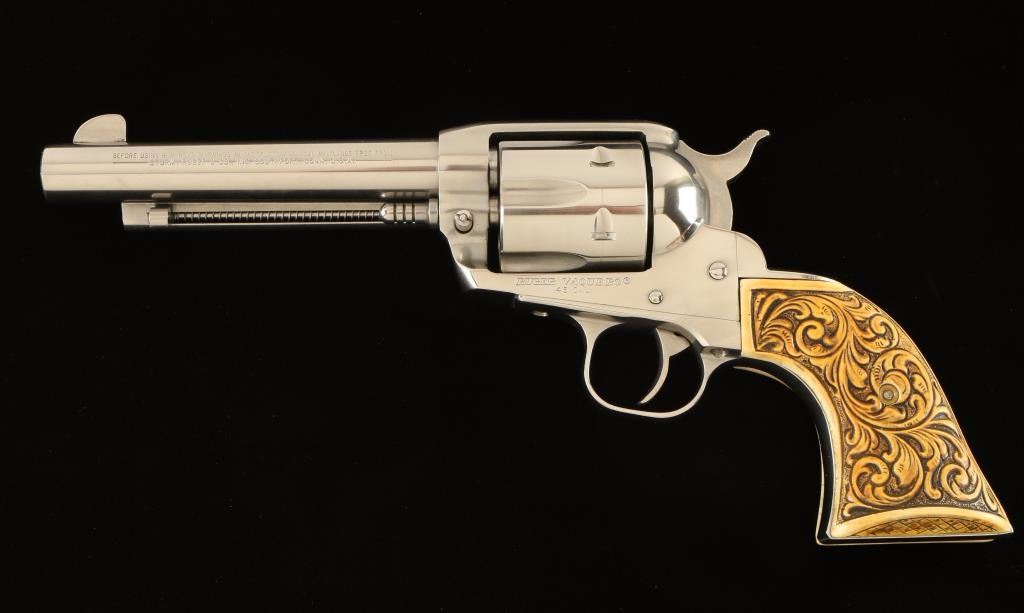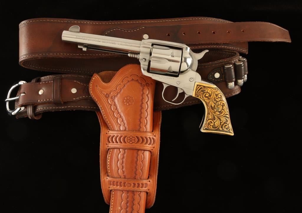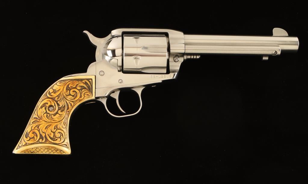 American made stainless steel single action revolver chambered in .45 Colt, circa 2002. Features a polished finish, 5 1/2" barrel, ejector rod, blade front sight, square-notched rear sight, serrated hammer spur, transfer bar safety, fluted six-shot cylinder, smooth trigger, and two-piece faux carved ivory plastic grips. Includes a tooled brown leather holster and cartridge belt. Revolver exhibits light holster wear, superficial scratches/scuffs and a drag line on the cylinder. Action is very smooth, bore is excellent and grips are fine. Condition is near excellent. ***Modern Firearm***