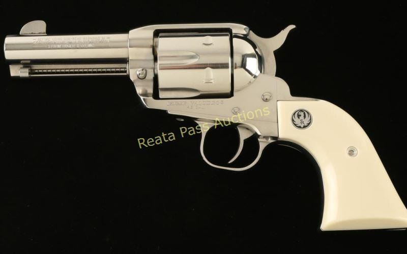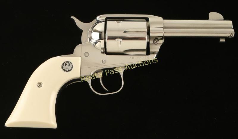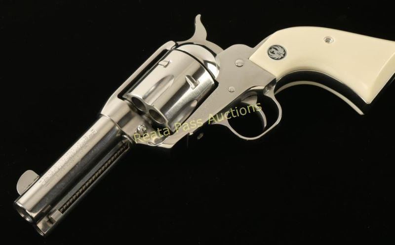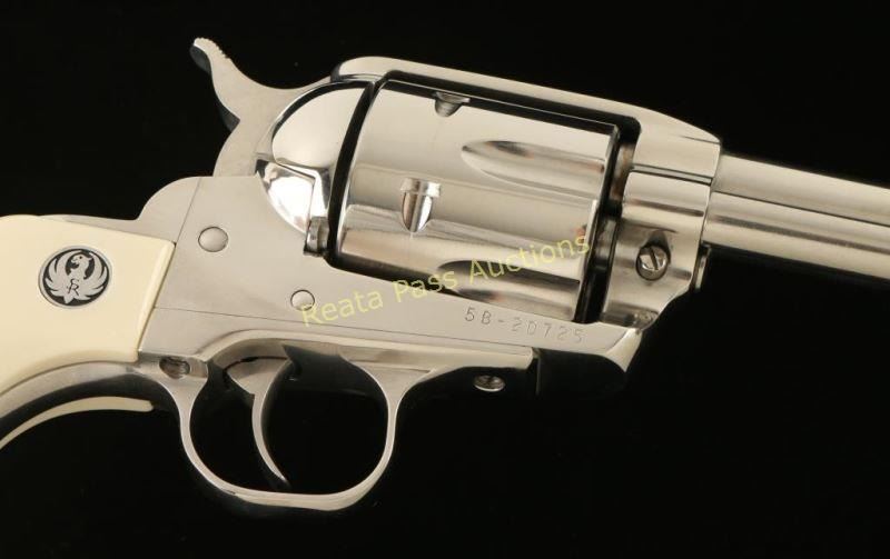 Stainless steel single action revolver chambered in .45 Colt, circa 2002. Features a high polished finish, 3 3/4" barrel, ejector rod, blade front sight, square-notched rear sight, serrated hammer spur, transfer bar safety, fluted six-shot cylinder, smooth trigger, and two-piece Ruger medallion faux ivory grips. Polished finish show only light handling wear with few superficial scratches and a light drag line. Action is smooth, bore is excellent and grips are fine. Condition is near excellent. ***Modern Firearm***