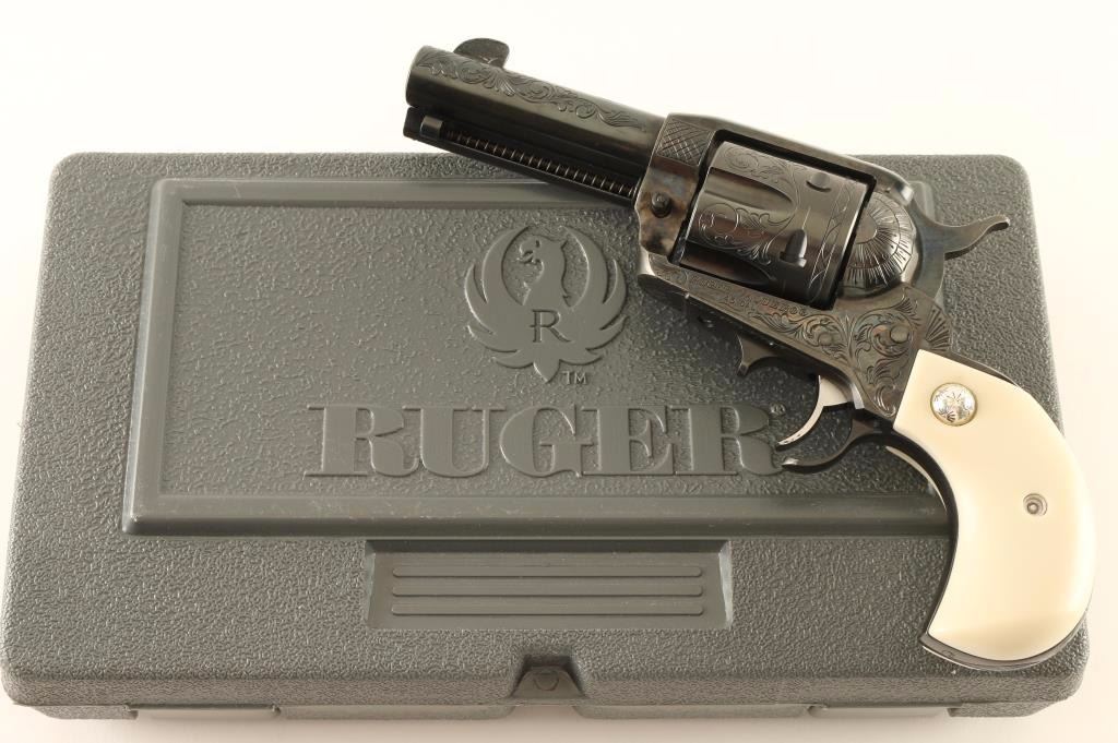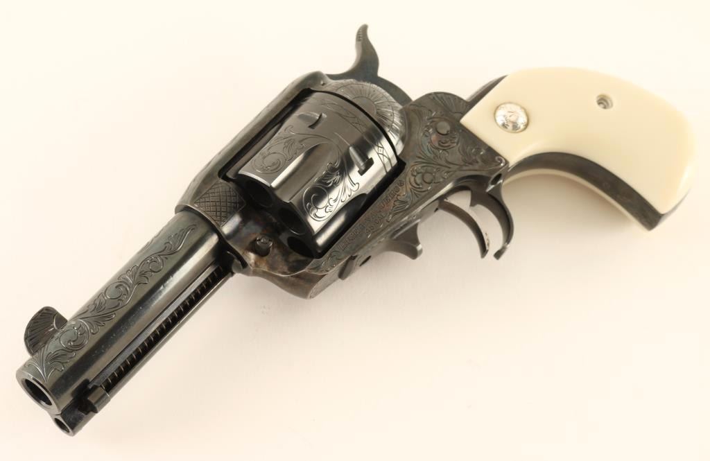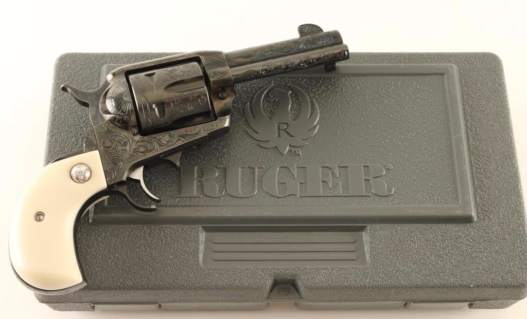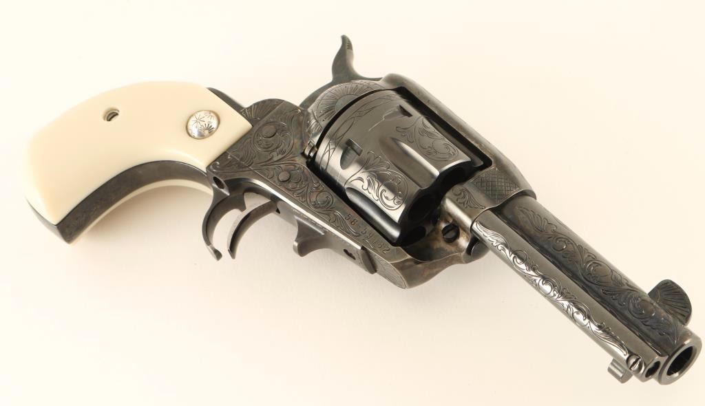 Engraved & customized single action six-shot revolver chambered in .45 Colt, circa 2004. Feature a custom blued/dark case hardened finish, fine scroll engraving, 3 3/4" barrel, ejector rod, blade front sight, square notched rear sight, fluted cylinder, custom cylinder pin with flat head, modified trigger guard, smooth trigger, serrated hammer spur and two-piece faux ivory birds head grips with round concho medallions. Includes a factory hard case with manual. Revolver exhibits approximately 97% of it's custom finish which shows a light drag wear on the cylinder and some minor handling marks. Action is very smooth, bore is excellent and grips are fine. Condition is excellent as customized. ***Modern Firearm***