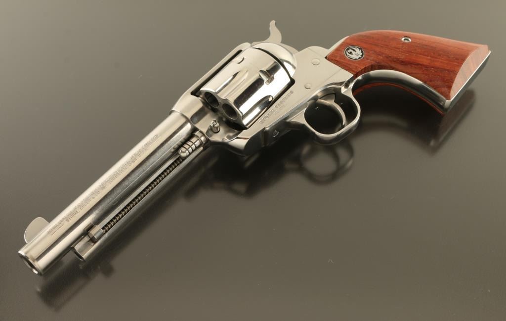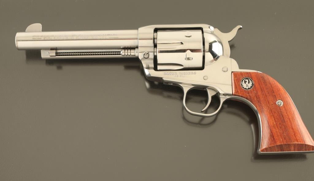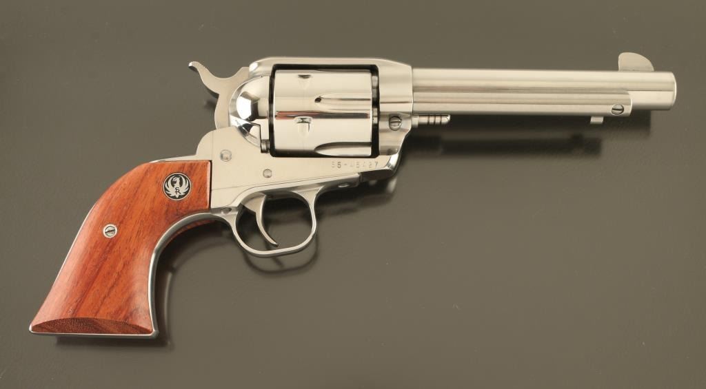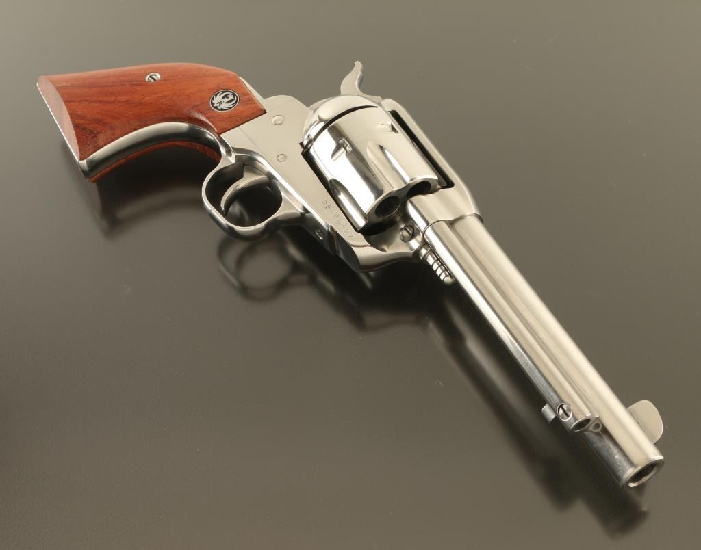 Single action revolver features stainless steel construction, wood grips with Ruger medallions, 5.5" barrel with fixed sights, ejector rod under barrel, 6 shot cylinder, loading gate on right side. Bore is excellent. Overall appearance is like new, with few signs of handling. Condition is NRA Excellent - Like New *** Modern Firearm ***
