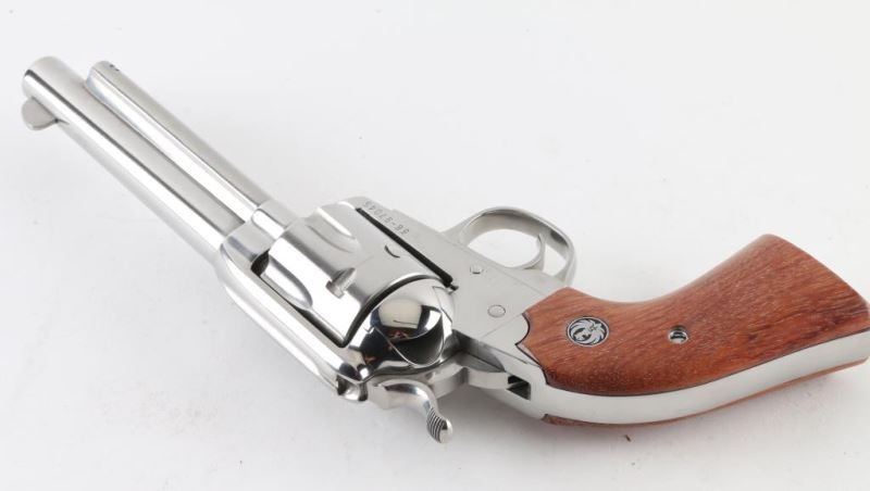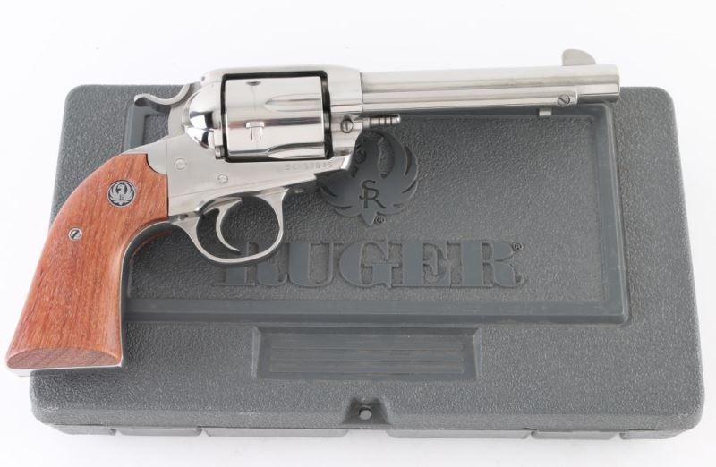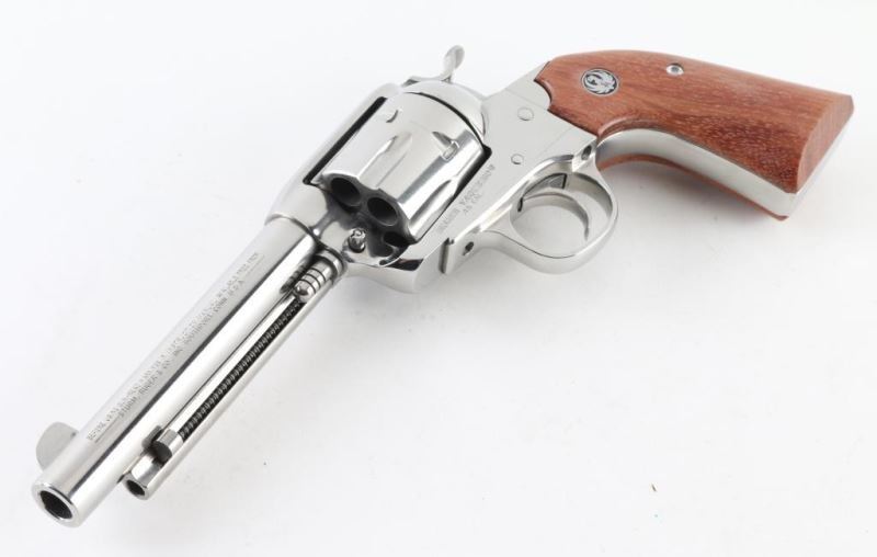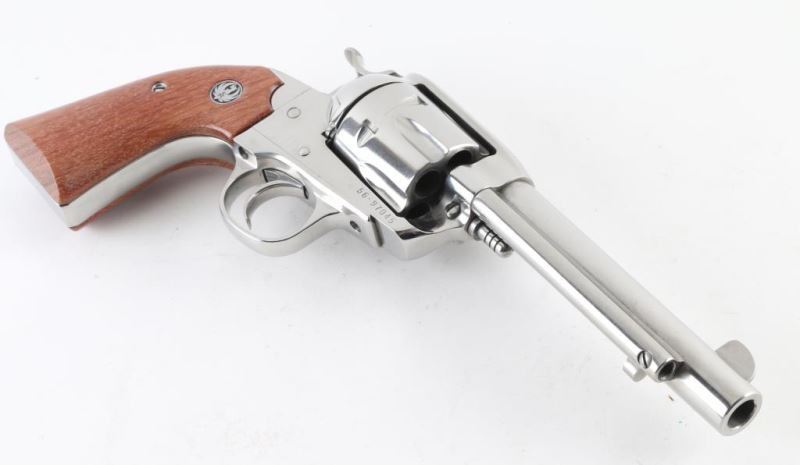 Western styled single action revolver features stainless steel construction, wood grips with Ruger medallions, 5.5" barrel with fixed sights, ejector rod under barrel, 6 shot fluted cylinder, loading gate on right side. Bore is very good condition. Overall appearance is like new, with few signs of handling, some small dents to grips. Action is smooth with tight lock-up. Includes gray plastic Ruger box with manual. Condition is NRA Excellent *** Modern Firearm ***