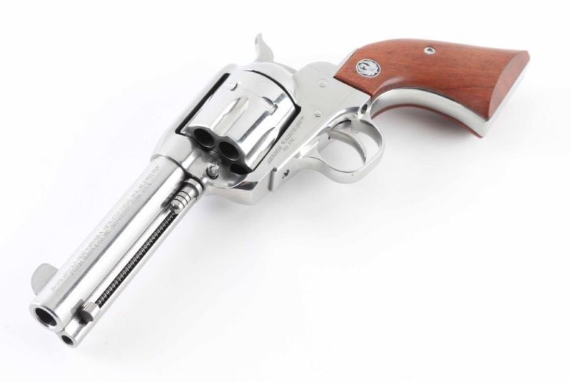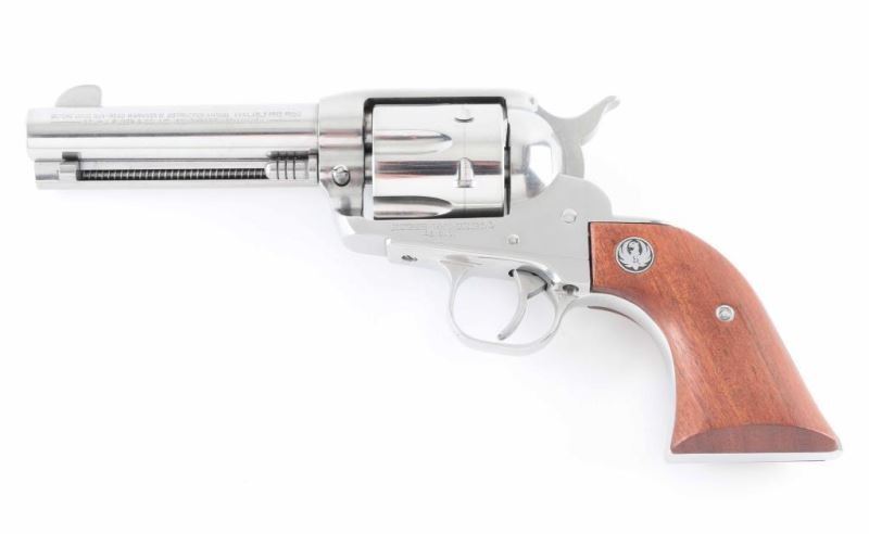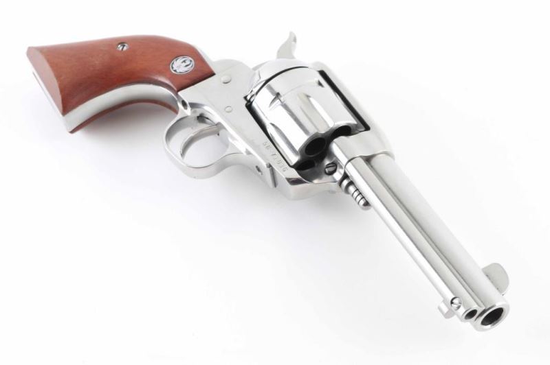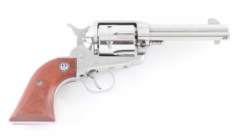 Modern Single Action Only revolver chambered in .45 Colt. Stainless 4.5" barrel and frame show some signs of wear but not much. Slight drag line on cylinder. Fixed blade front sight and machined in rear sight. Serrated hammer spur. Wood grips with Ruger medallion are in good shape with a scuffed spot on the back of the right grip. Bore looks good. NRA Very Good Modern Firearm