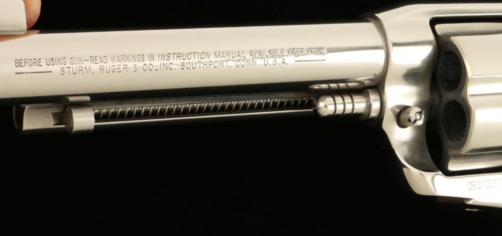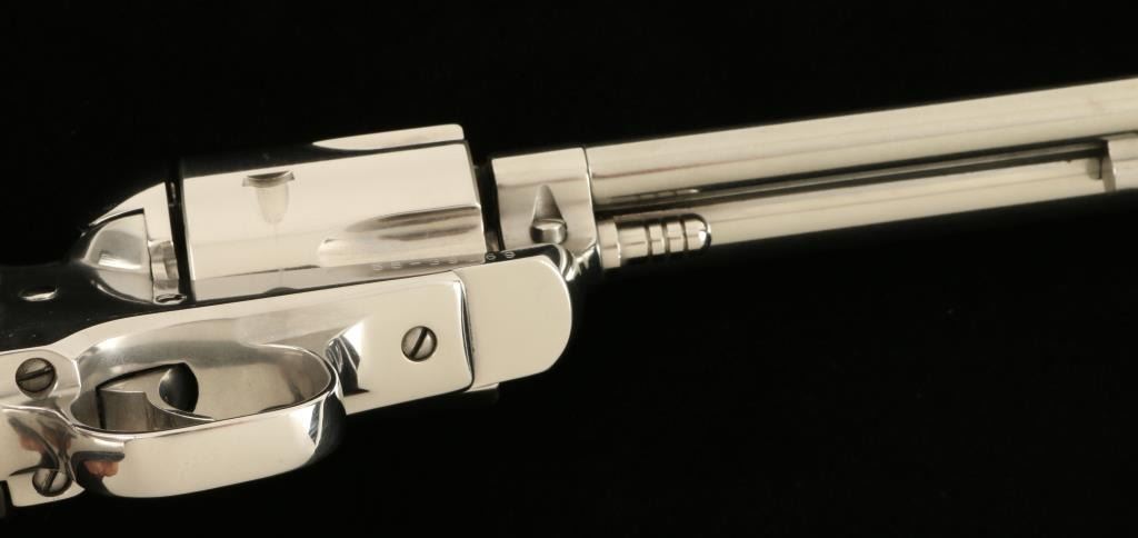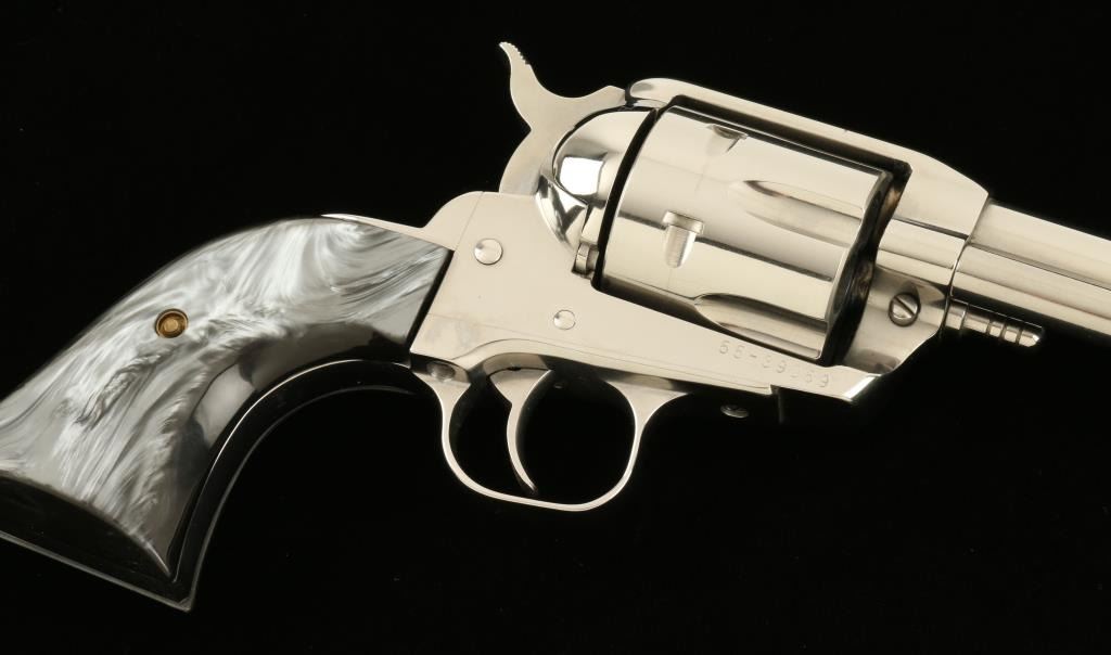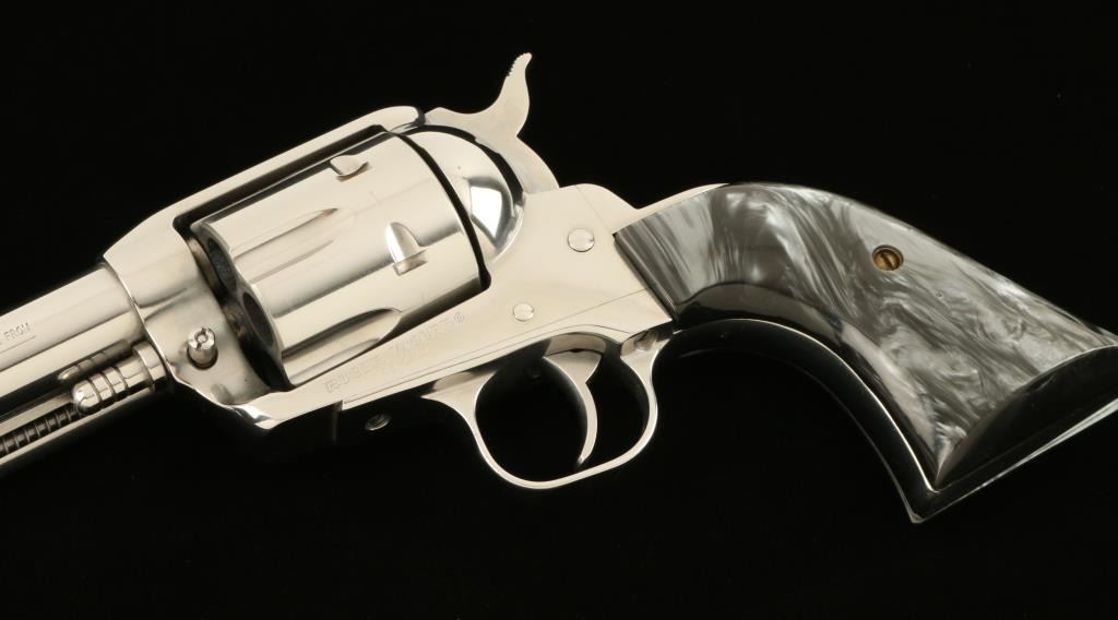 Ruger Vaquero SA revolver, .45 cal., 5 ½” barrel, plastic grips, nickel finish, S/N 55-39069. This revolver remains in overall excellent condition showing majority of its nickel finish with a drag line on the cylinder. The grips are in very goodcondition but do not fit the revolver well. The action is crisp and the bore is very good. (Modern/PPT). Est.: $300-$600