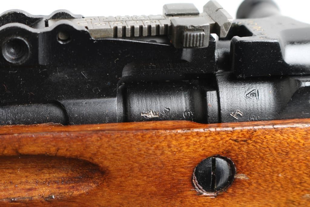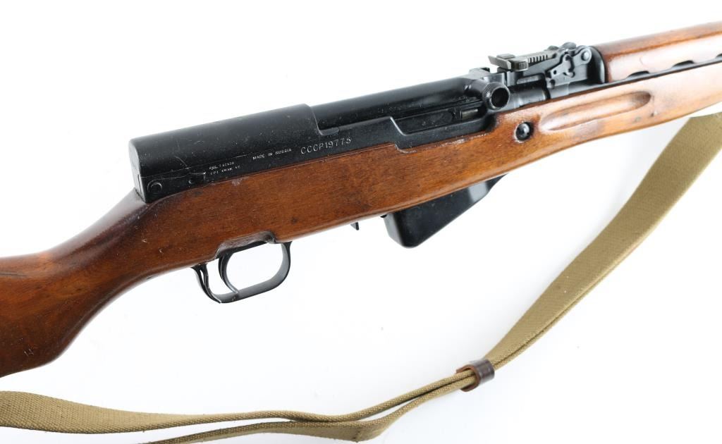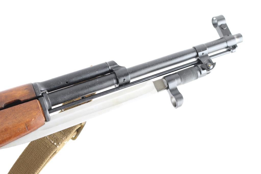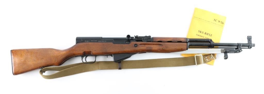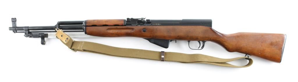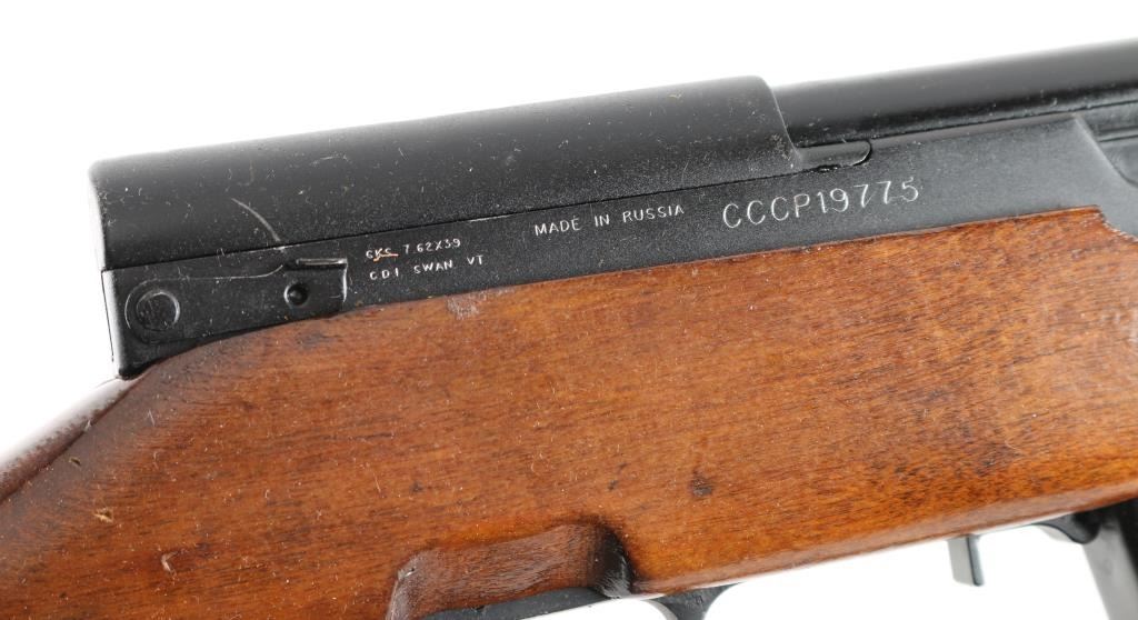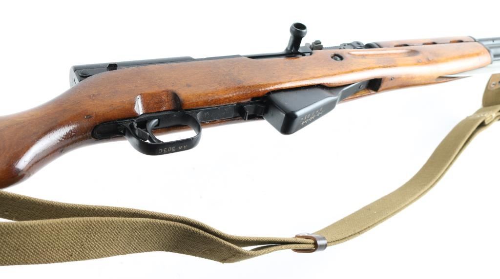 Russian semiautomatic rifle imported by CDI, Swansea, VT. Appears arsenal reworked. Features 20" hard chrome lined barrel, protected post front and tangent rear sights, fixed 10 rd magazine with hinged floorplate, manual safety, hardwood stock with trap in butt for cleaning kit, sling swivels, folding blade bayonet, cleaning rod. Original factory serial number AH3030 matches on receiver, bolt carrier, triggerguard, and stock. Magazine is force matched. Bore is very good condition. Metal retains 90% blued finish with scrapes and scuffs, bare metal showing on some sharp edges. Bayonet blade appears hard chromed. Stock is very good condition, with scuffs & dents. Importer has added their serial number to right side of receiver. Includes khaki color cotton web sling (proper type for SKS), small collection of accessories. Condition is NRA Very Good+ as arsenal reworked *** C&R Firearm ***