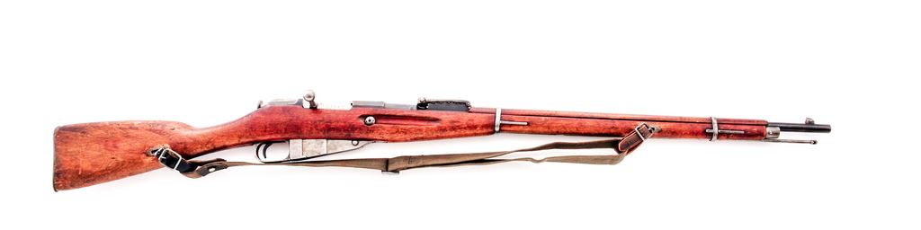 Russian Model 1891 Type Mosin-Nagant Bolt Action Rifle, #31176, 7.62x54R cal., 29.7'' barrel, blued finish, hardwood stock, unprotected blade front sight and adjustable leaf curved rear sight. Stamped on receiver ring with Czarist crest over two-line Cyrillic script over ''1905'' over an early Izhevsk Arsenal mark. Finnish ''SA'' property stamp on left side. There is also an intact czarist crest on the chamber flat of the hexagonal receiver. Mismatched numbers, most small parts stamped with early Izhevsk arsenal stamps. Includes cleaning rod and very good condition Finnish ''SA'' stamped cotton and leather sling. Condition overall is very good with approx. 50% bluing remaining on metal surfaces, fading and bright in some areas. There is a crack in the handguard behind the rear band, otherwise the wood is very good with roughness on the right side butt and overall dents and handling marks. Action is smooth, bright bore is very good+. No visible import stamps. Est.: $250-$400. (C&R)