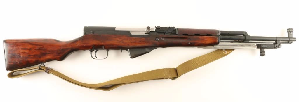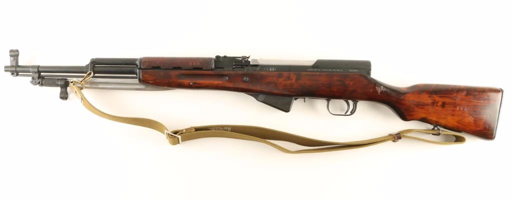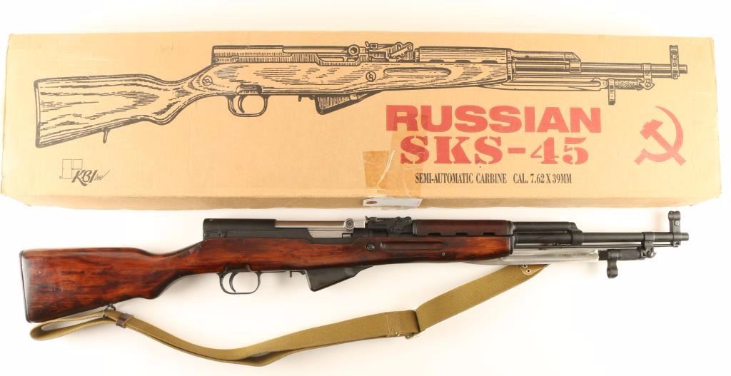 Russian military semi-automatic rifle chambered in 7.62x39mm, circa 1954. Imported by KBI Inc of HBG, Pennsylvania with import marks on receiver. Features matching numbers, black parkerized finish, 20 3/8" barrel, hooded post front sight, graduated rear sight to 1,000 meters, cleaning rod, blade style bayonet, 10 round fixed magazine, manual safety, canvas sling, smooth wood handguard and pistol grip wood shoulder with trapdoor metal buttplate & cleaning kit. Includes original cardboard box from importer with stripper clips, ammo pouch, oiler and documents. Rifle shows light muzzle wear, scuffs, and some paint transfer on cover with approximately 97% finish intact. Action is smooth, bore is pristine and wood stocks are near fine with few blemishes. Condition is near excellent. ***C&R Firearm*** ***Modern Firearm***
