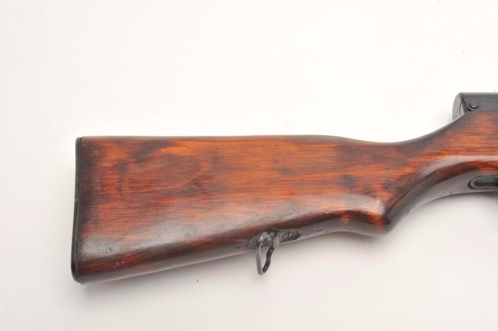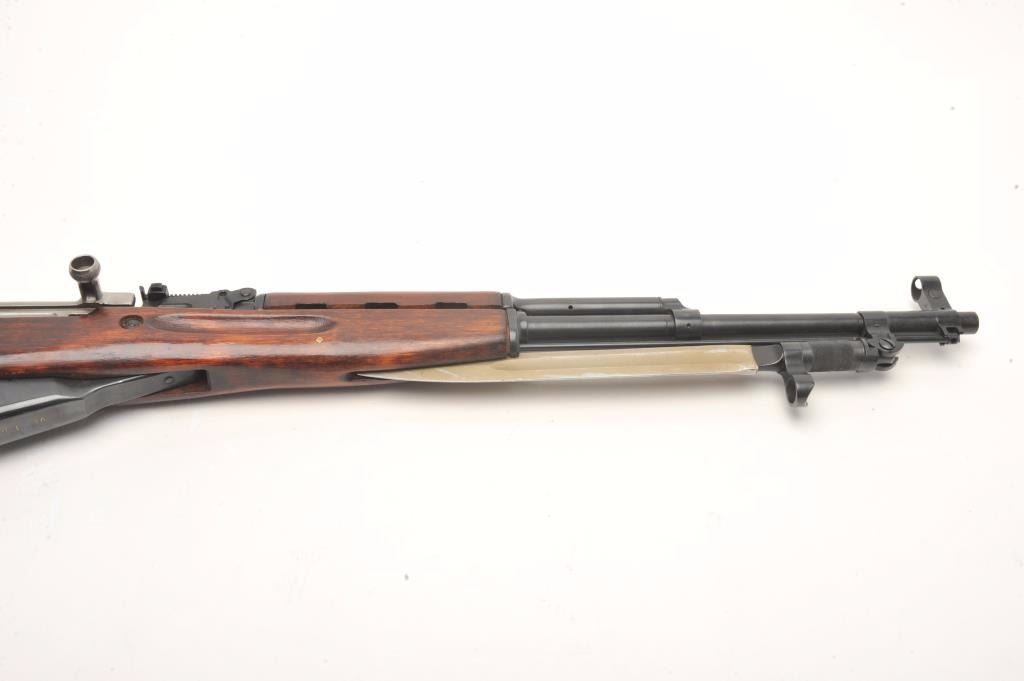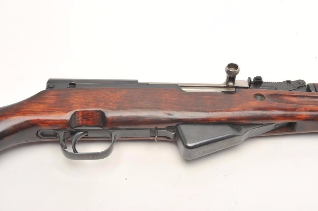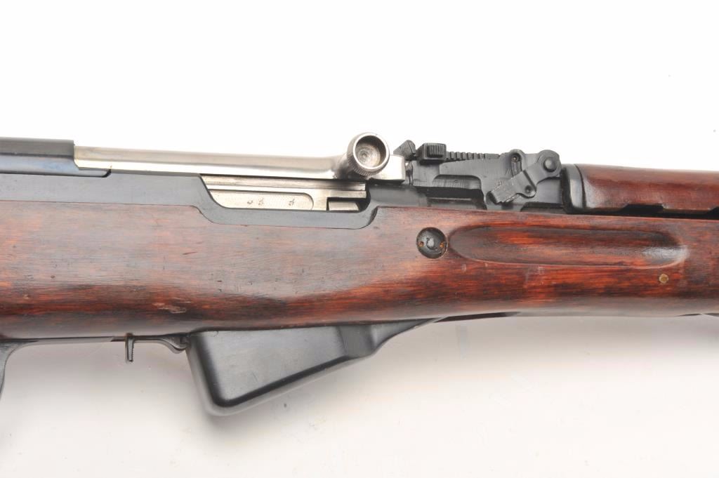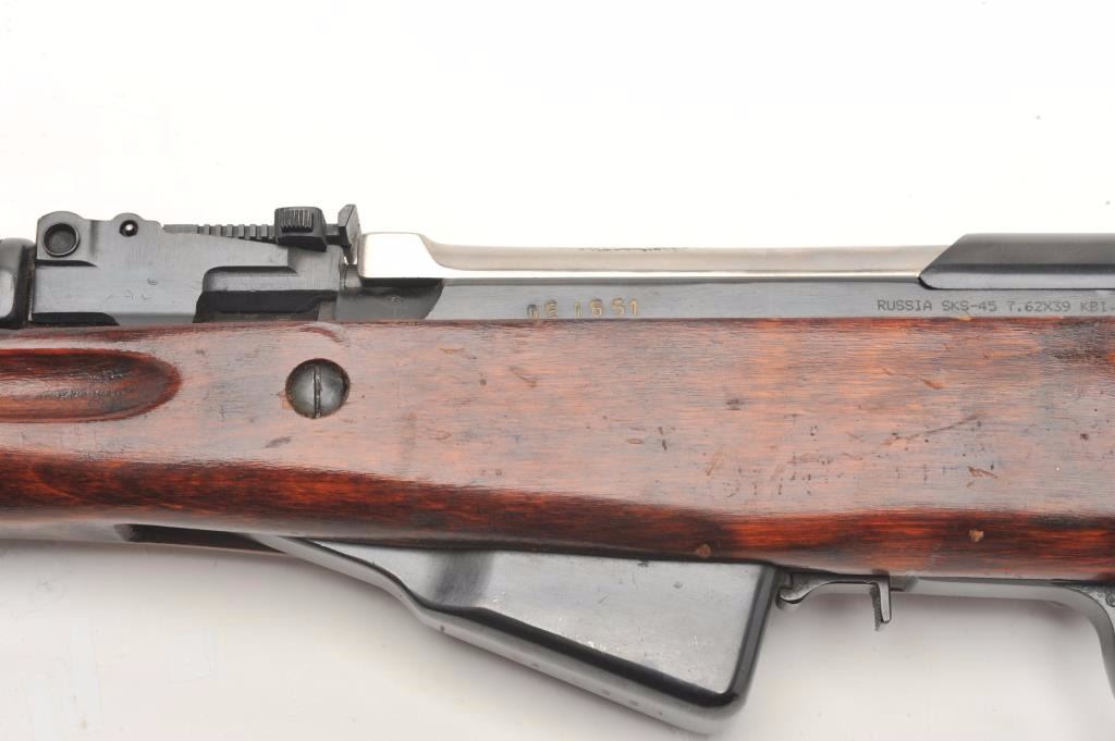 Russian SKS semi-auto rifle, 7.62 x 39 caliber, serial #OE1651. The rifle is in very good overall condition with a 20” barrel with hooded front and military style tangent rear sights. The barrel and receiver retain nearly all of their military finish with only minor storage marks noted. All visible serial numbers including the butt stock are matching. There is minor light surface rust on the bolt and the dust cover is dated 1953. The smooth wood stock is in good condition showing small mars and handling marks. The butt stock ends with a smooth steel butt plate with trap. The rifle includes a proprietary folding bayonet. The chromelined bore is very good, the action crisp and markings are sharp. A clean, lightly used SKS. (Modern) Est.: $150-300.