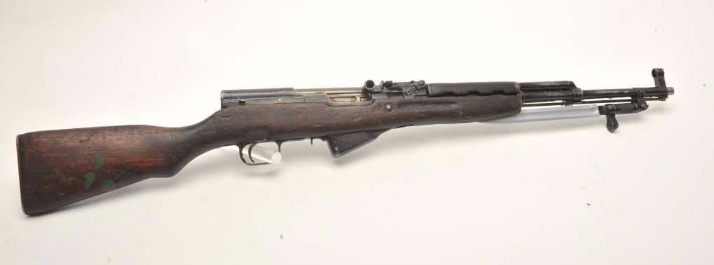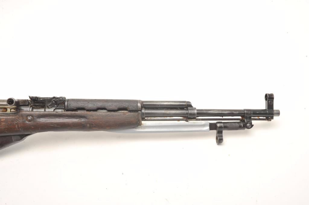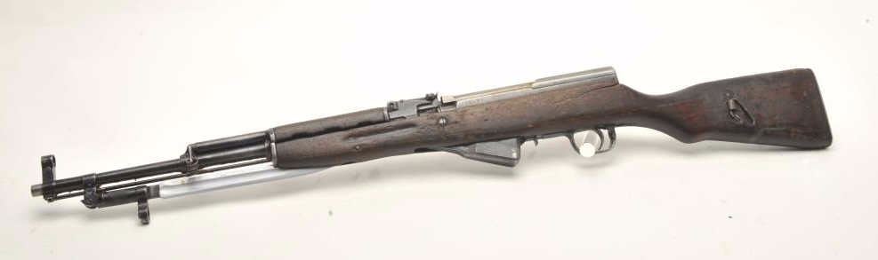 Russian SKS semi-automatic rifle, 7.62 x 39 caliber, 18.5” barrel, military finish, wood stock, folding bayonet, S/N 15121, in overall fair to good condition; heavily loaded with grease for storage, good action, stock showswear and scattered old mars, dings and scratches from carry and storage. (Modern). Est.: $400-$800.