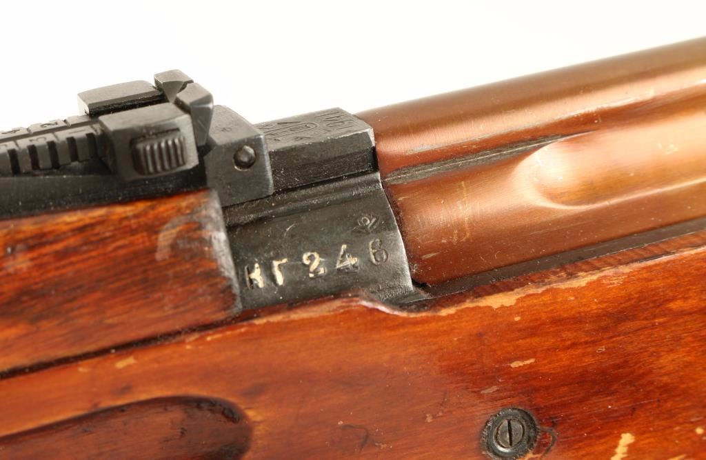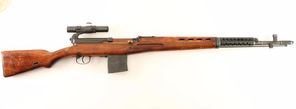 SN: Kr246/T09072 'M1940' Russian military gas operated semi-automatic service rifle chambered in 7.62x54Rmm, produced at the Kovrov arsenal circa 1941. Imported by C.D.I. of Swanton, V.T. with discrete import marks on the right side of the receiver. Features a blued finish, 26.5" barrel with integral muzzle break & bayonet lug, hooded post front sight, tangent rear sight graduated to 1,500 meters, reproduction 3.5x PU scope, smooth trigger, manual safety, folding magazine release, 10 round magazine, manual safety, stripper clip guide on the top cover, ventilated metal upper handguard, smooth hardwood ventilated handguard and semi-pistol grip shoulder stock with smooth metal buttplate. The original "Kr246" serial numbers is stamped on the receiver & stock and has been electro-penciled onto the bolt handle & bottom metal. Rifle exhibits approximately 95% of it's blued finish showing a copper toned bolt, light scattered wear and a small amount of old pitting under the finish on the top cover. Action is very smooth, bore dark with decent rifling & scattered pitting and wood stocks are very good with several small blemishes. Condition is very good. ***C&R Firearm*** ***Modern Firearm***