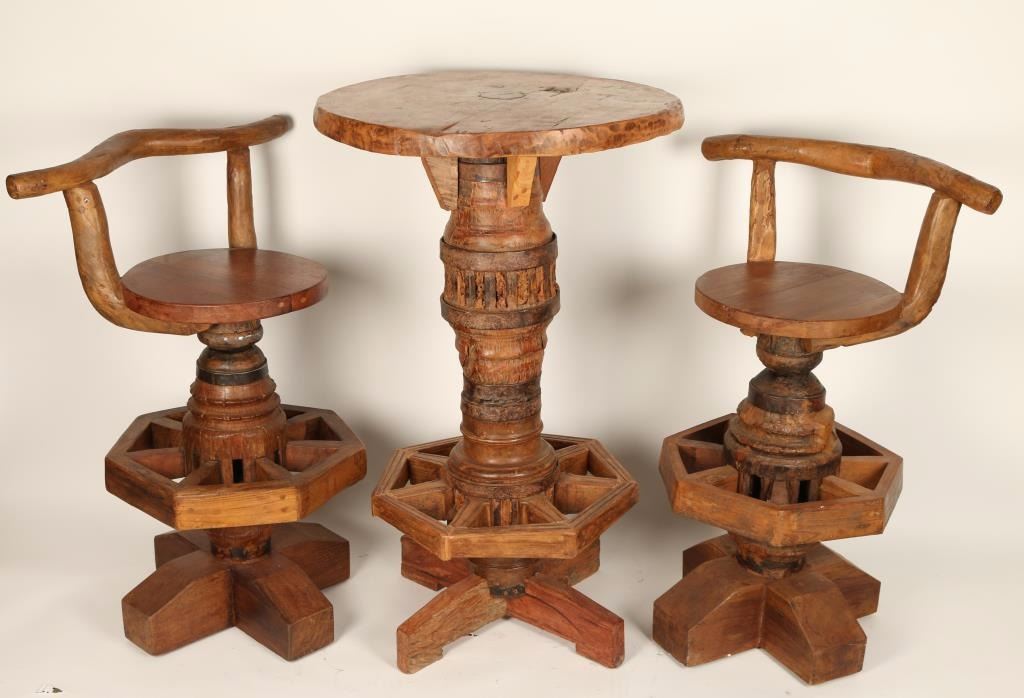 Tavern style with a round tabletop and wagon wheel footrest. Measures 43 1/2"h x 27" dia. Comes with 2 stools with curved single log backs that also have the wagon wheel footrest and heavy solid base. Measure 40"h x 28"w x 18"d. Seat height is 29 1/2". Great for cabin, Western, or Southwest decor.