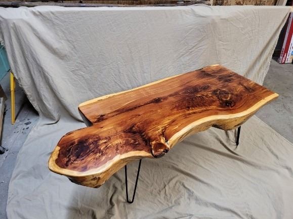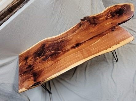 Rustic design with modern flair hairpin legs. Will fit with any décor from Modern to Log Cabin and all designs in-between. This is a one-of-a-kind that will surely be a conversation piece no matter where you proudly display it. The beauty of Western Red Cedar, with its velvet deep color, grain and knots, is truly breathtaking. This coffee table is designed to be used! Tabletop is at 19 inches high with full 3-inch cedar slab that is protected with 3 coats of semi-gloss for durability. The steel hairpin legs come with bottom protectors to help protect your floor while also making the table very stable. Table is approximately 20 inches wide and 55 inches long at the longest length.