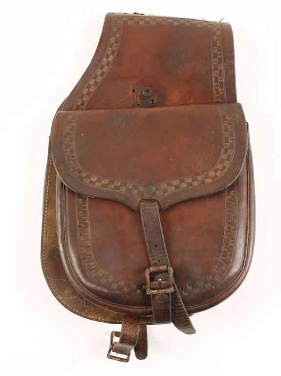 made in Pueblo Colorado, maker marked twice under flaps, circa 1920's, smooth brown leather with checker line work, in good condition.