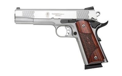 Precision. Accuracy. Performance. With a remarkable selection of SW1911's, Smith & Wesson continues its tradition of innovation and its commitment to bringing shooters the finest quality high performance firearms. Smith & Wesson's variations of John Moses Browning's extremely popular 1911 design can be seen in the production, Pro Series, and Performance Center line of SW1911 pistols. These 1911's are manufactured with a wide variety of materials, finishes and unique features and are favorites in any collection. The grips are the Wooden Laminate E-Series grips. Includes two 8 round magazines.