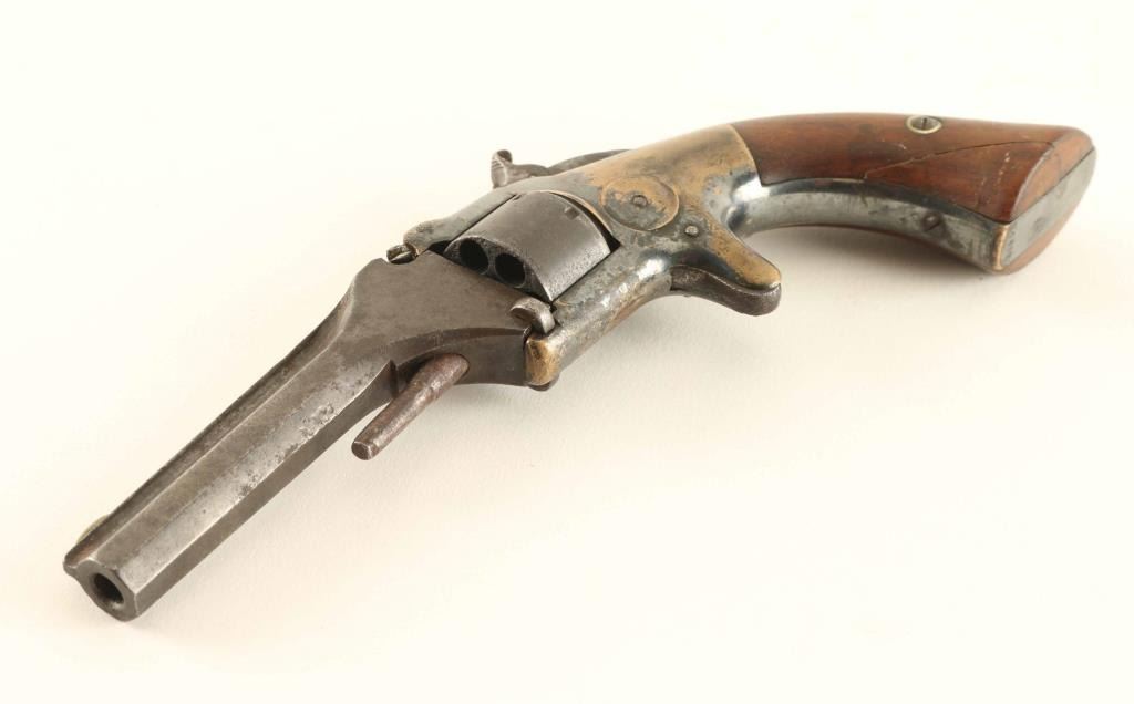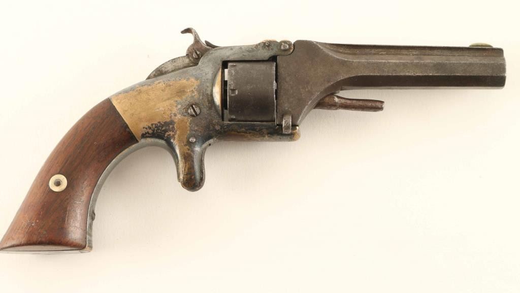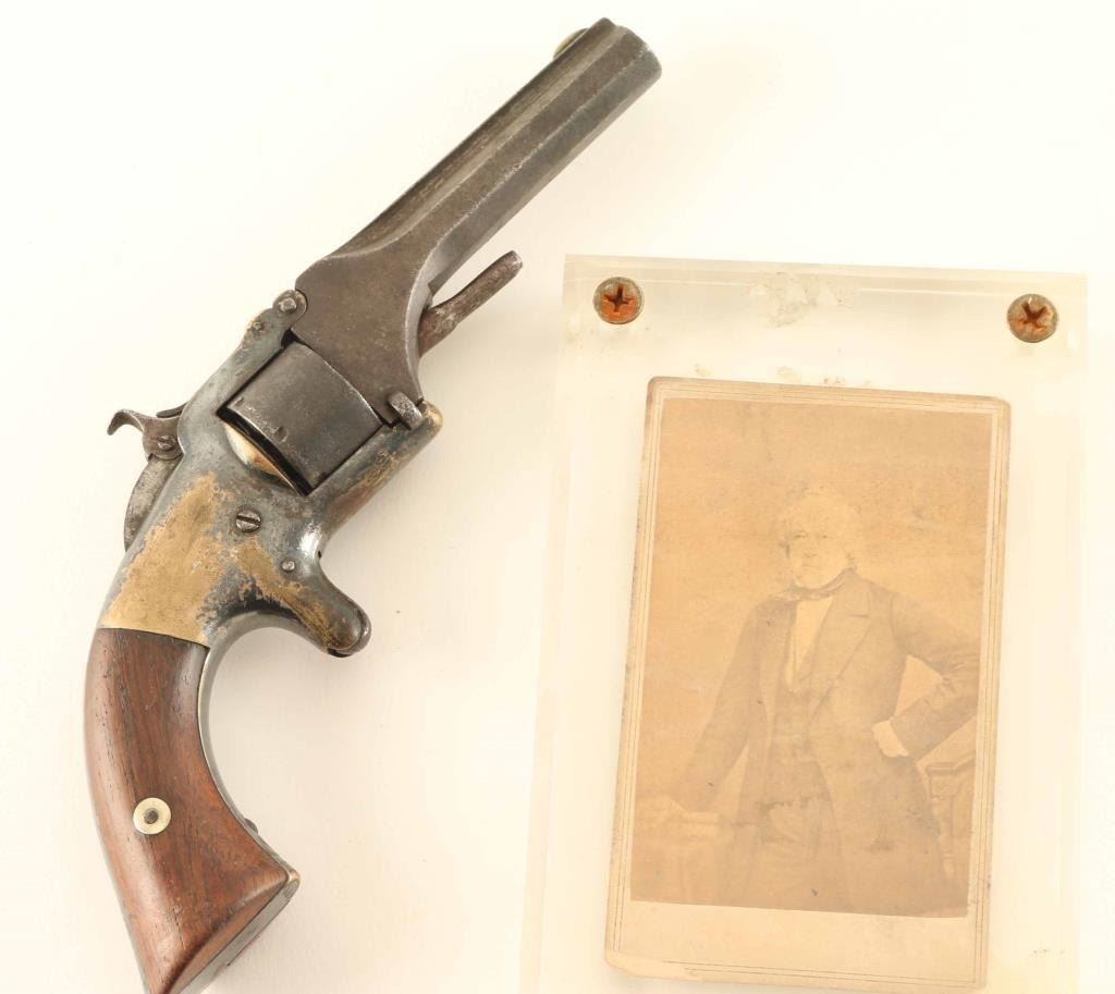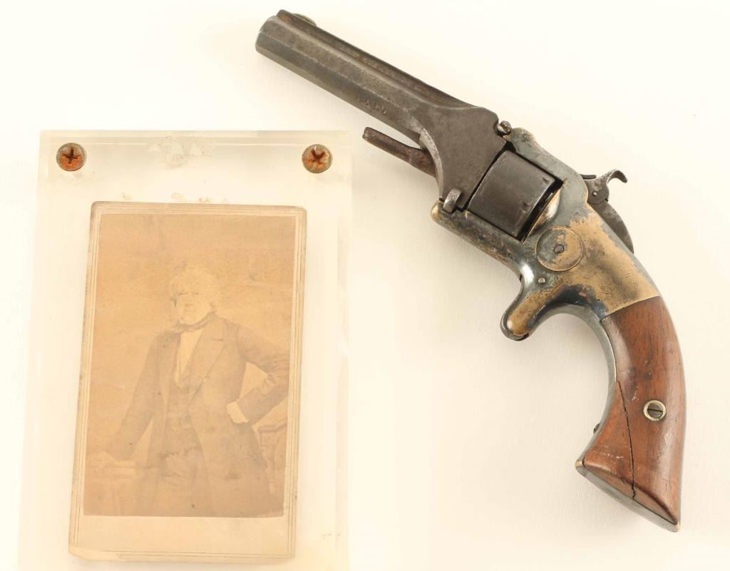 1st Model 1st Issue 6th variation .22 caliber seven shot revolver, S/N 10832. This was S&W’s first metallic cartridge firearm and a important early cartridge arm patented 1855 and 1858. This revolver is in “As Found” uncleaned condition with dark almost black silver remaining on the frame. The ejector rod is a period blacksmith made replacement. The barrel address is legible and there is some minor pitting and patina finish on the barrel and cylinder. The grips show a large crack and piece glued back. The action is working but not locking up. Loose on the barrel pin. The “Grand daddy” of Smith & Wesson’s as well as American cartridge revolvers that bring high dollars in better condition. Along with "carte de visite" of John Slidell confederate ambassador as displayed by old collector with this revolver. Condition is NRA Good ****Antique Firearm****