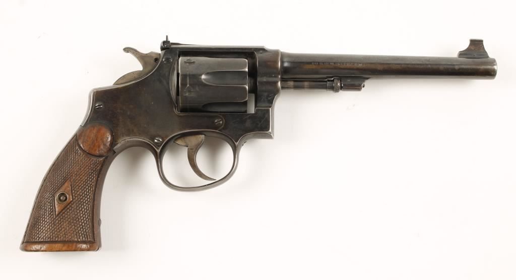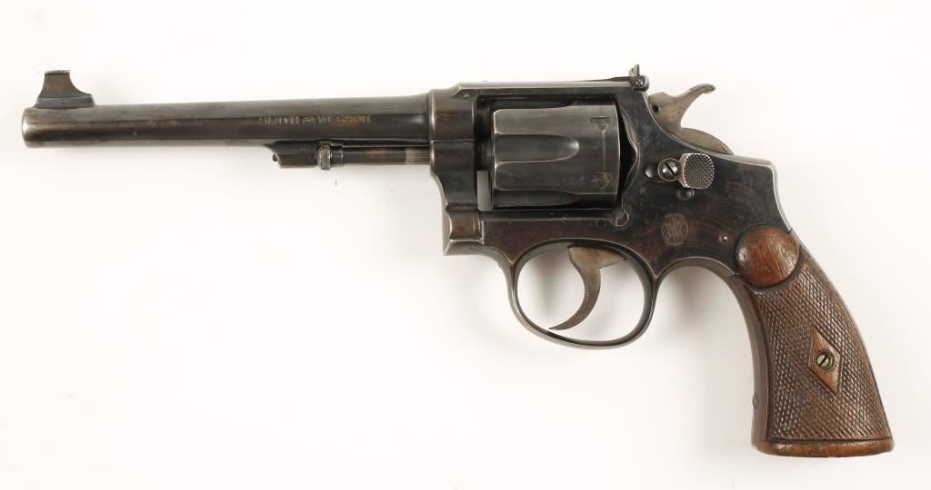 4th Change Target. Blued double-action 6-shot revolver with a 6" barrel, front target sight and adjustable rear sight. Rear sight contoured to match the topstrap of the frame. No serrations in the grip straps. Checkered hammer and trigger. Walnut "diamond" grips with no medallions. Metal finish is faded and worn with edge wear and a drag line. The grips are worn down with very few dings. The chambers are clean and the bore is bright with good rifling. The bolt doesn't engage the cylinder. Condition is good. *Modern Firearm*