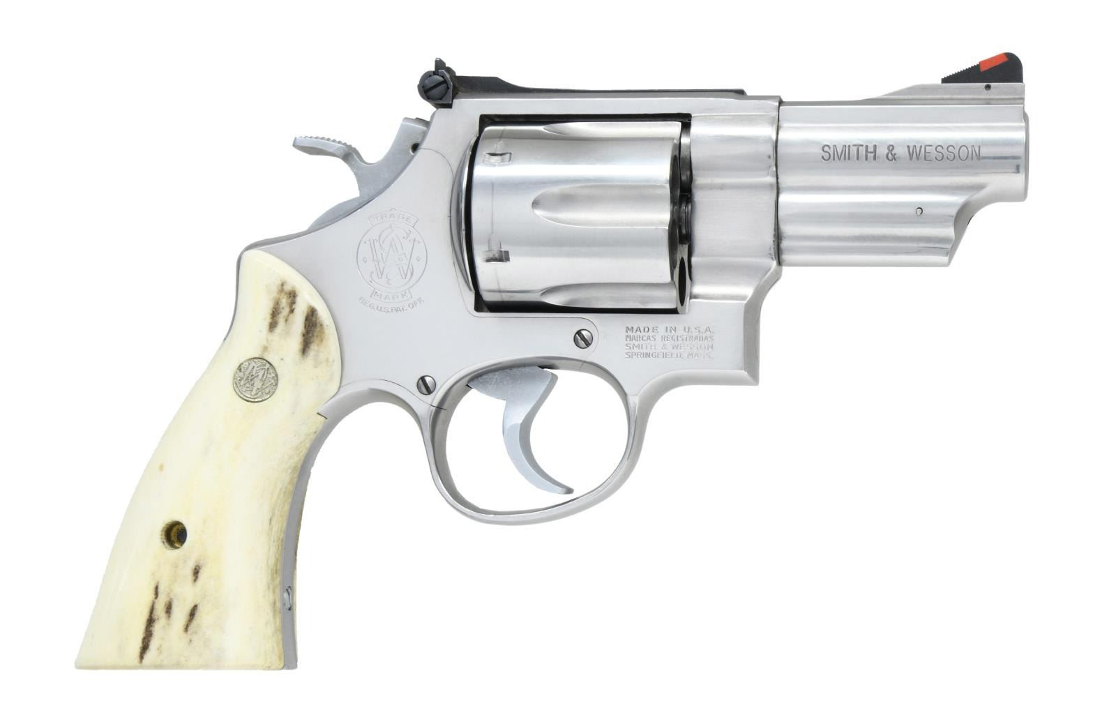 Cal. 44 Mag. S# AHR6617. Bbl. 3". The Backpacker edition, similar to the 629 but w/ shorter Bbl., Originally issued w/ Hogue rubber grips, red ramp front & white outline rear adjustable sights. Grips have been replaced w/ S&W monogrammed white bone. CONDITION: stainless surfaces show numerous fine to light scratches w/ a visible dragline on the cylinder. Grips show light usage marks. Bore is very good, bright & strongly rifled. (23-1040/CW) MODERN. $700-1,000.
