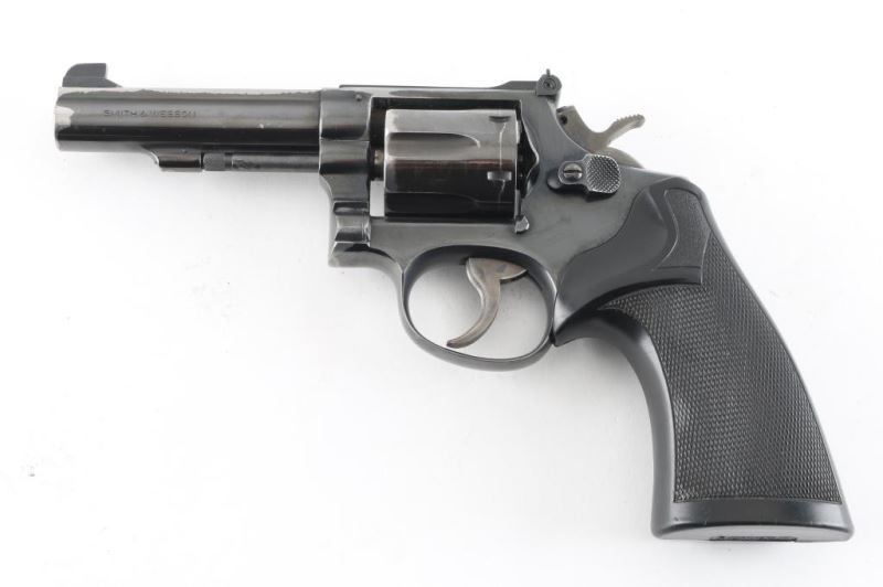 Revolver. S/A, D/A. 6-rd capacity. The K-38 Target Masterpiece. Built on the square butt K target frame. Model 14-2. (1961) cylinder stop changed,delete triggerguard screw. 4" pinned, serrated ribbed barrel with partridge front and adjustable micrometer click rear sights. Wide serrated trigger, Blued finish, case-hardened hammer and trigger Checkered Pachmayr hard rubber grips. Bore and cylinders appear very good but dirty Action is crisp/tight. Standard markings. Blued finish is about 70% with edge wear, handling loss and scratches. Grips are very good. NRA Condition-Good. Modern Firearm.