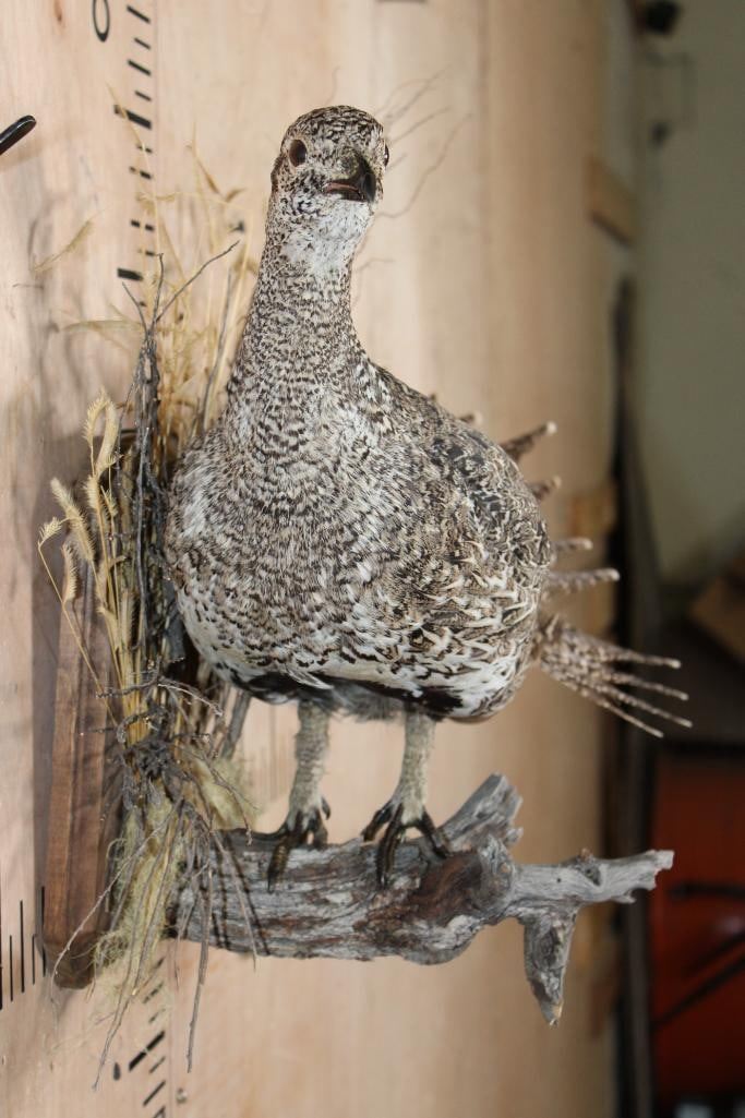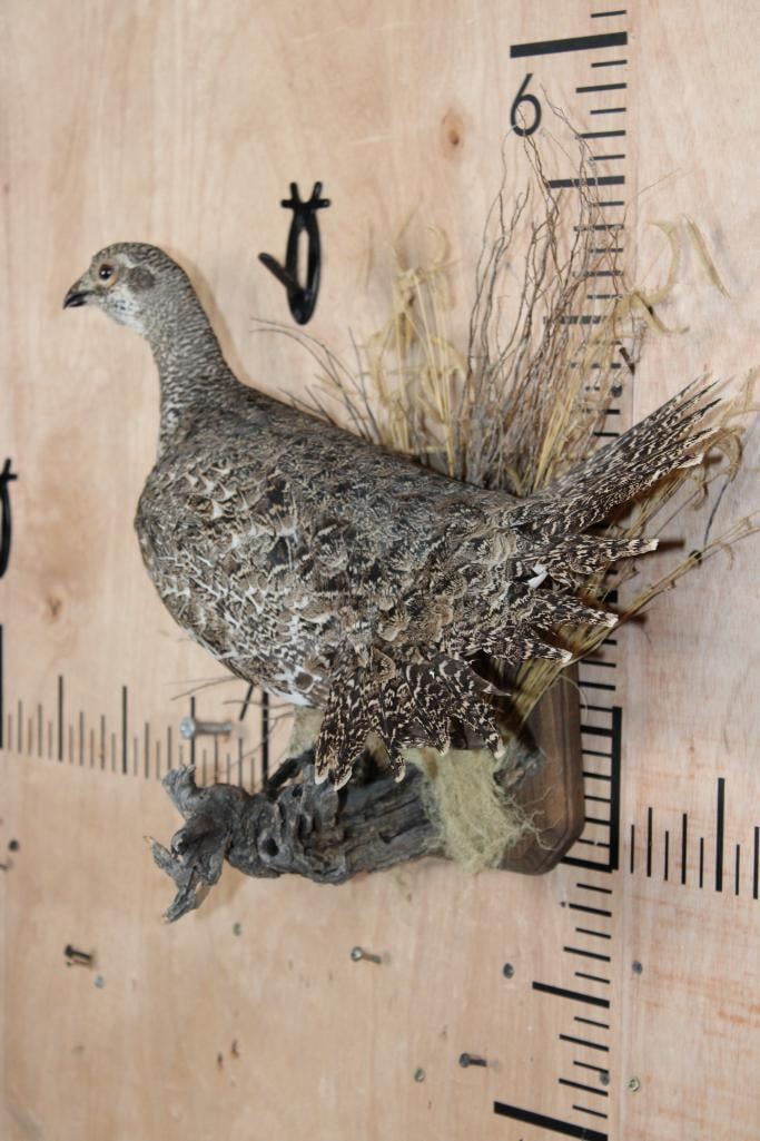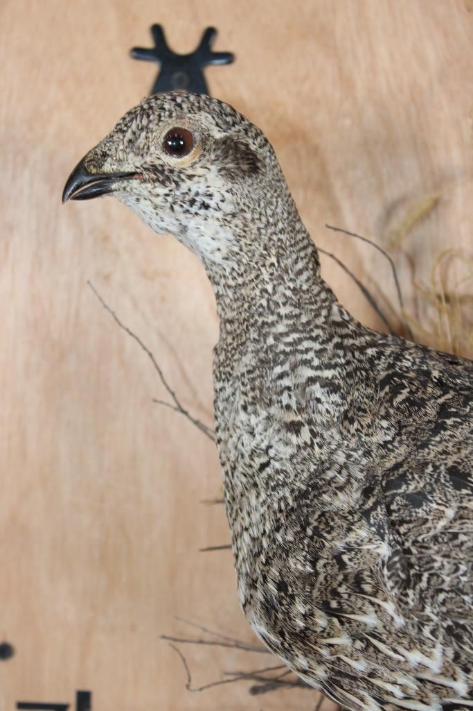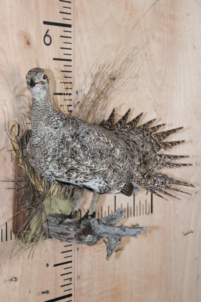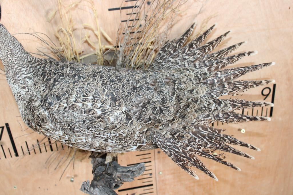 Nice Life-sized SAGE GROUSE Perched on a Decorative Wood Plaque. It measures 20" Long x 15" Tall x 10" Depth and is in Good Condition. TAXIDERMY BIRDS