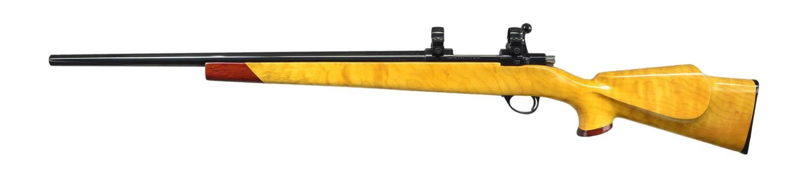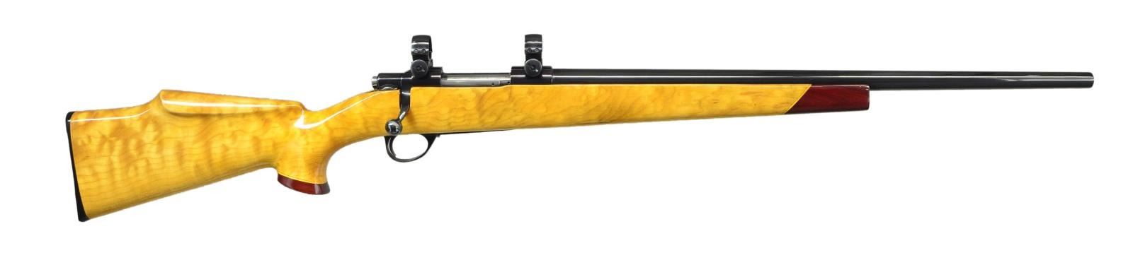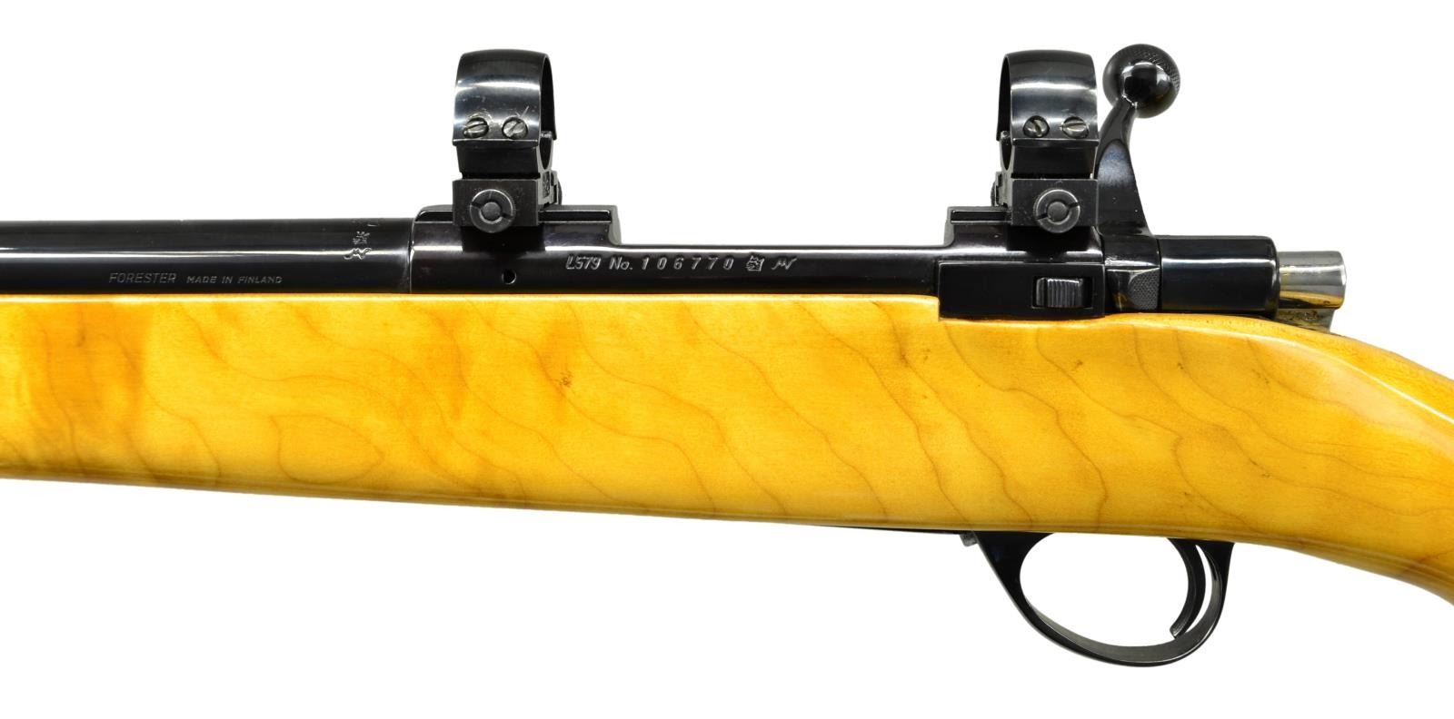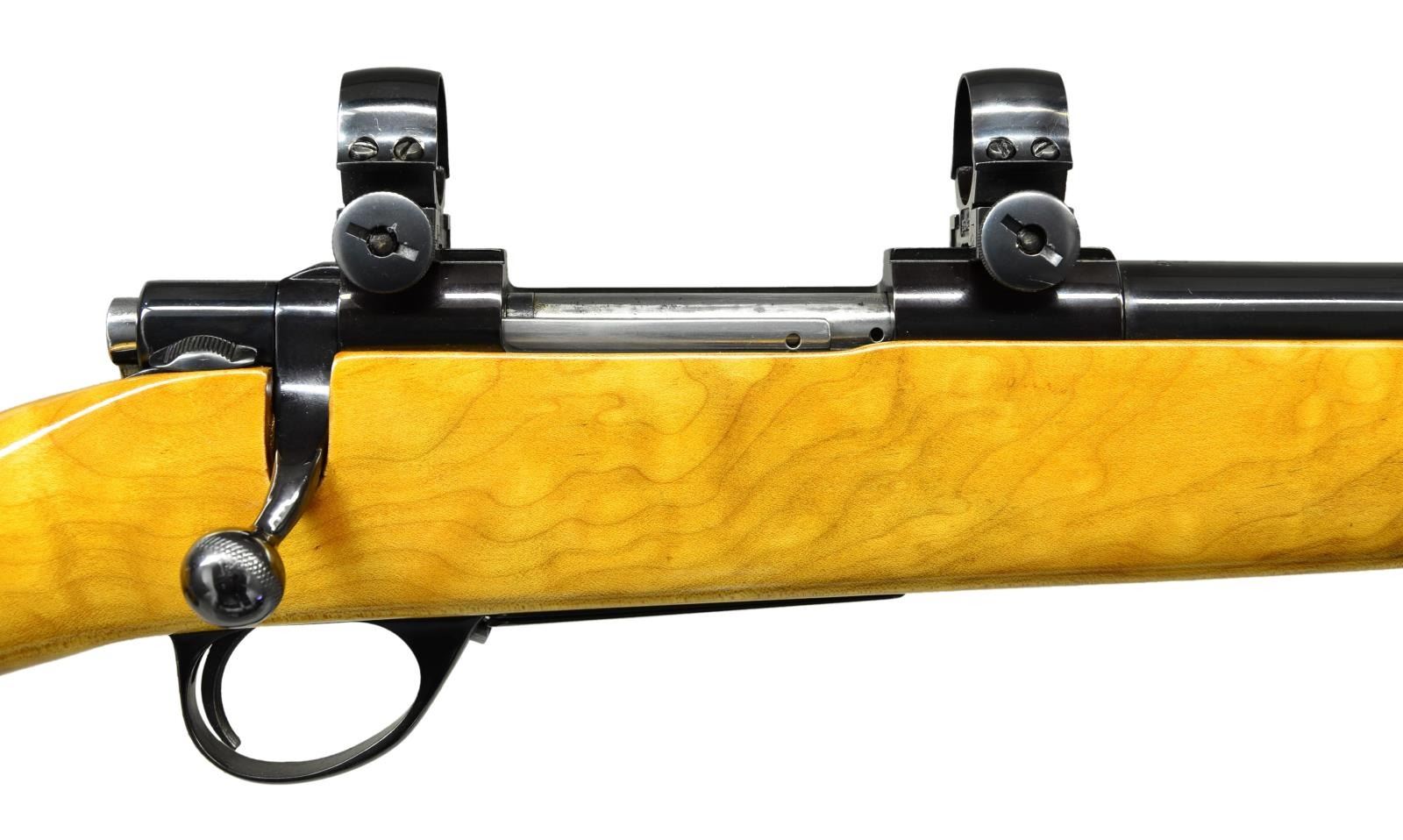 Cal. 243 Win. S# 106770. Bbl. 24" varmint weight without provision for sights; Sako 1" factory rings attached to receiver dovetails. Mfg. early 1972 or by other references in 1971. Uncheckered maple stock having rosewood forend tip and grip cap; raised Monte Carlo cheekpiece plus factory grooved black plastic buttplate. Sculpted trigger guard with push button release hinged floorplate. Adjustable factory trigger with side slide safety. CONDITION: near excellent overall with very faint stock handling marks. Near excellent bore. (23-253/NW). CURIO. $500-750.