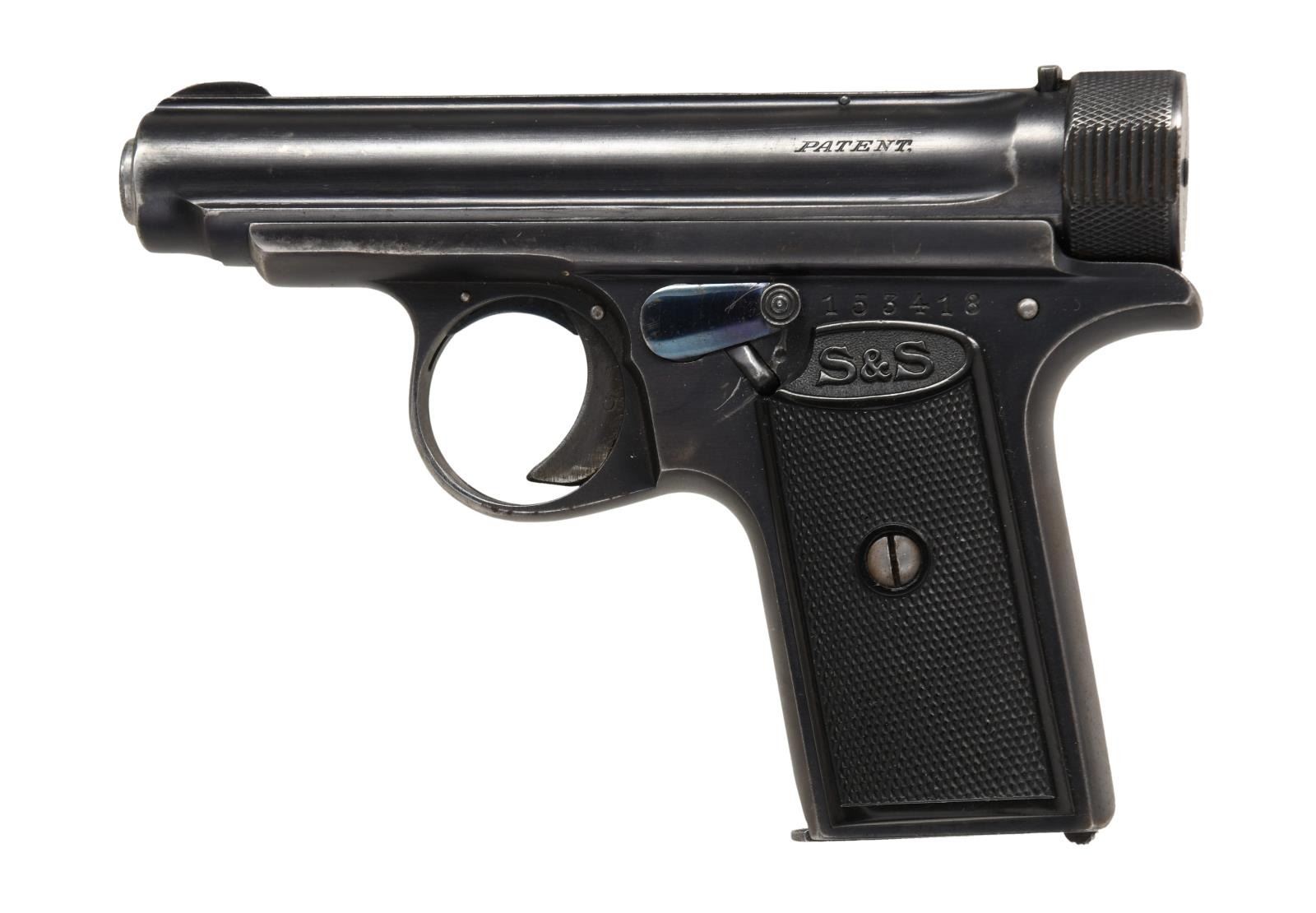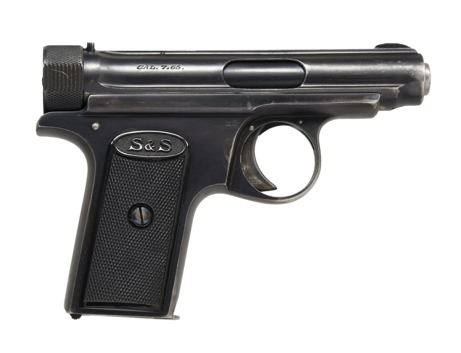 Cal. 7.65 mm. S# 153418. Bbl. 3". Fixed blade front & notch rear sights. Blued finish, fire blue on safety & extractor & "S&S" hard rubber checkered grips. "CROWN/N" on back of cocking knob & right side frame. MAGS: 1-7 rd factory. CONDITION: metal retains about 80% dull fading blue, 70% fire blue on safety & 50% on extractor. Left grip panel is chipped by safety arc. Bore is very good, bright & strongly rifled. (23-1071/CW). CURIO. $200-400.