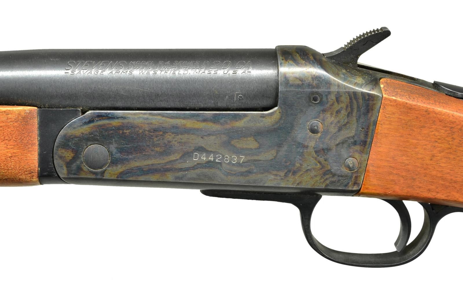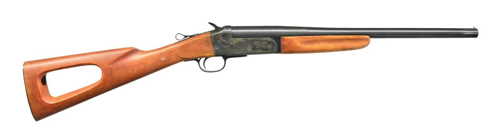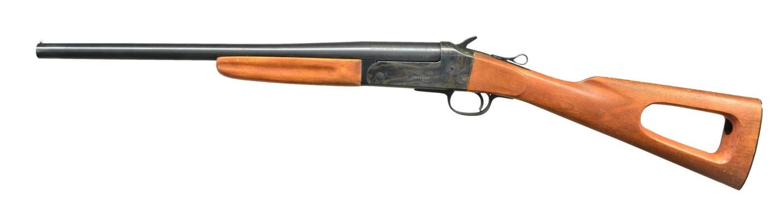 SHOTGUN. Cal. 20 Ga., 2 3/4" & 3". S# D442837. Bbl. shortened to 18 1/2" w/ bright bead & cyl. bore. Top lever has been skeletonized. Blued bbl. & case hardened action. Ejector. Replacement hardwood finger groove forearm & skeletonized hardwood stock w/ plate (remnants of previous recoil pad remain). CONDITION: very good blue w/ 1" polished area around muzzle. Very good lightly faded case colors. Very good wood finish. Very good bore. (23-771/MD). MODERN. $150-250.