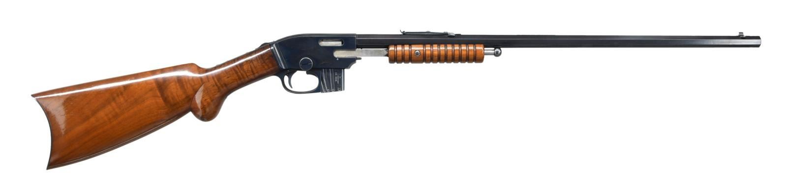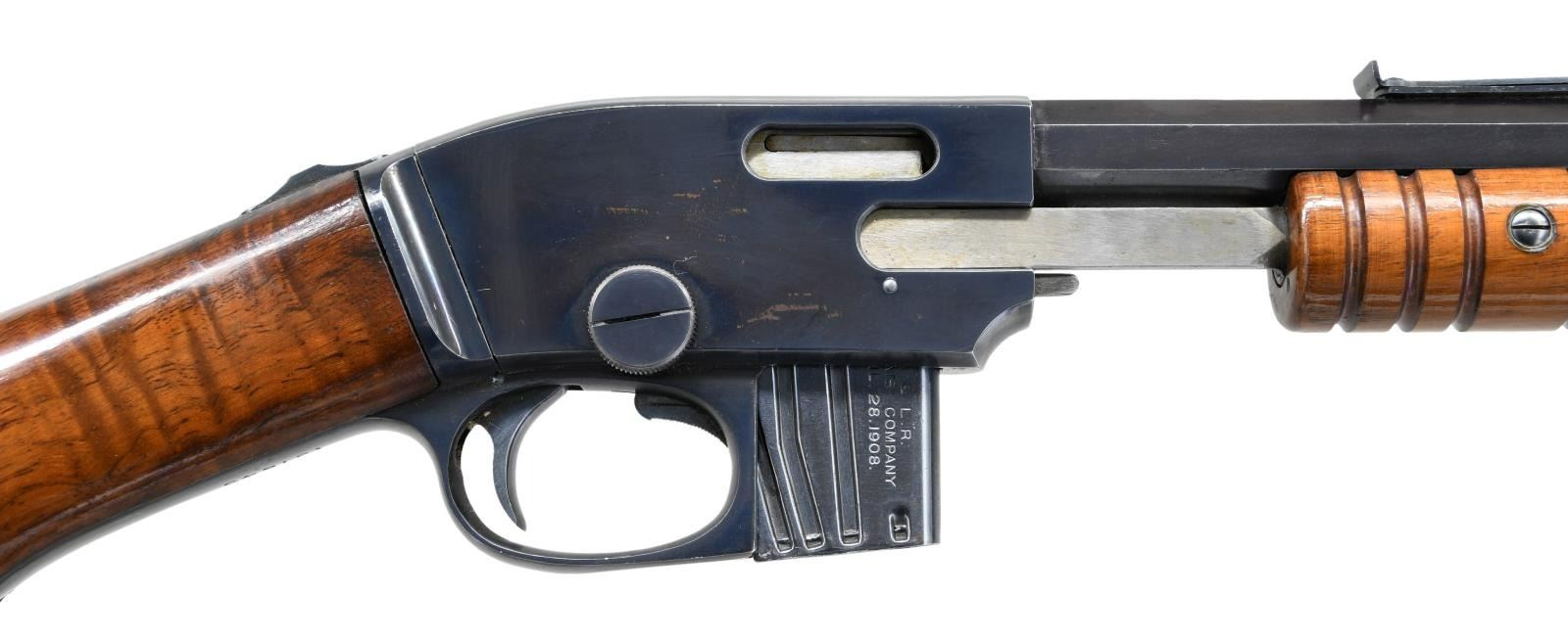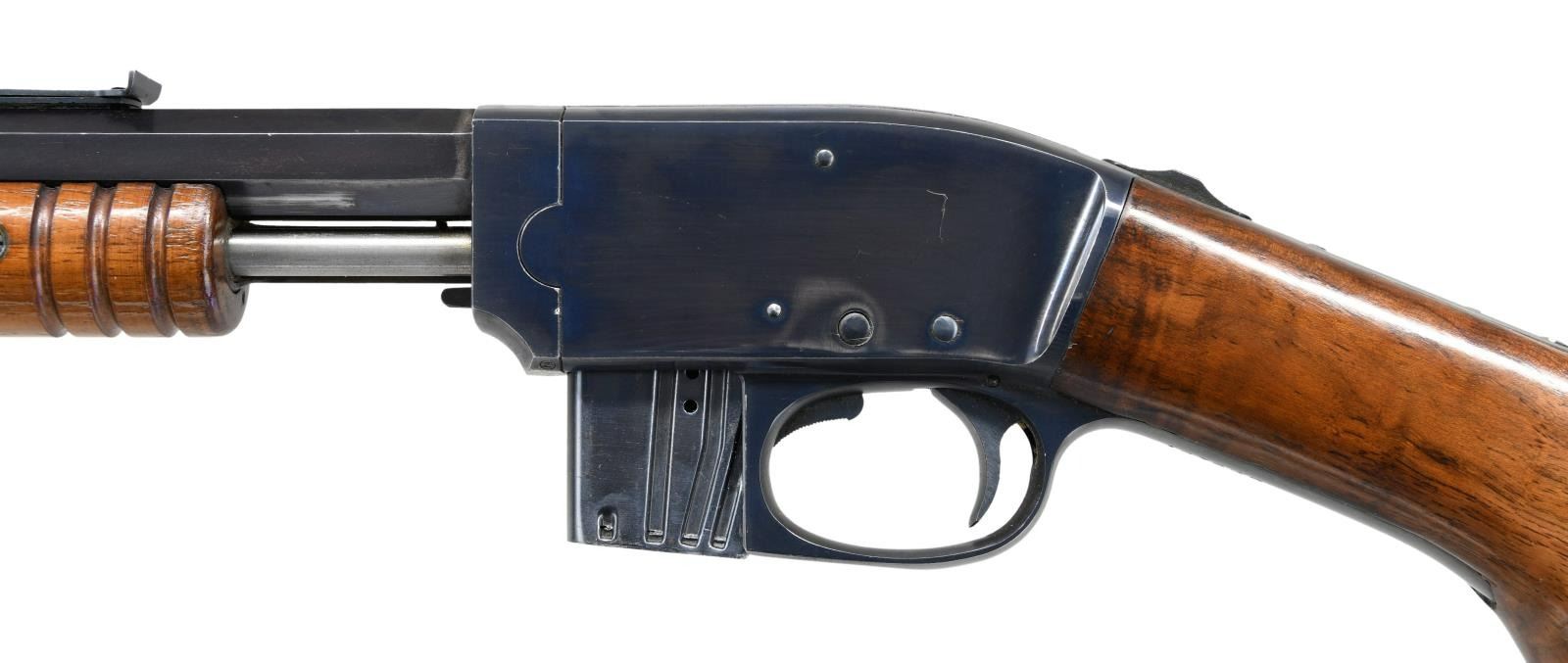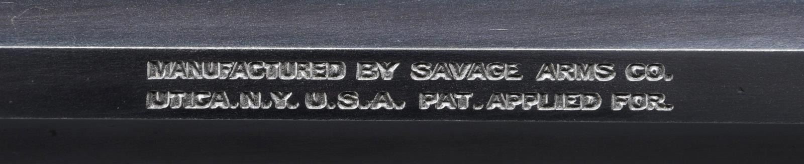 Cal. 22 S, L, LR. S# 137645 (Mfg. 1903-1922). Oct. bbl. has been shortened to 22". Blade front sight & Savage sporting rear sight. Blue finish. Takedown action. 11 Groove walnut forearm & rnd. knob pistol grip stock w/ Savage crescent buttplate. MAGS: 1-7 rd. CONDITION: over 90% blue showing spots of patina on right side of action, fading finish mixed w/ patina on buttplate along w/ light scratches, marks & pinprick patina throughout. Sanded & refinished wood has very good appearance w/ repaired break on left side of wrist. Very good bore w/ light frosting near muzzle. (23-242/MD). MODERN. $300-500.