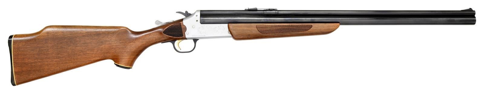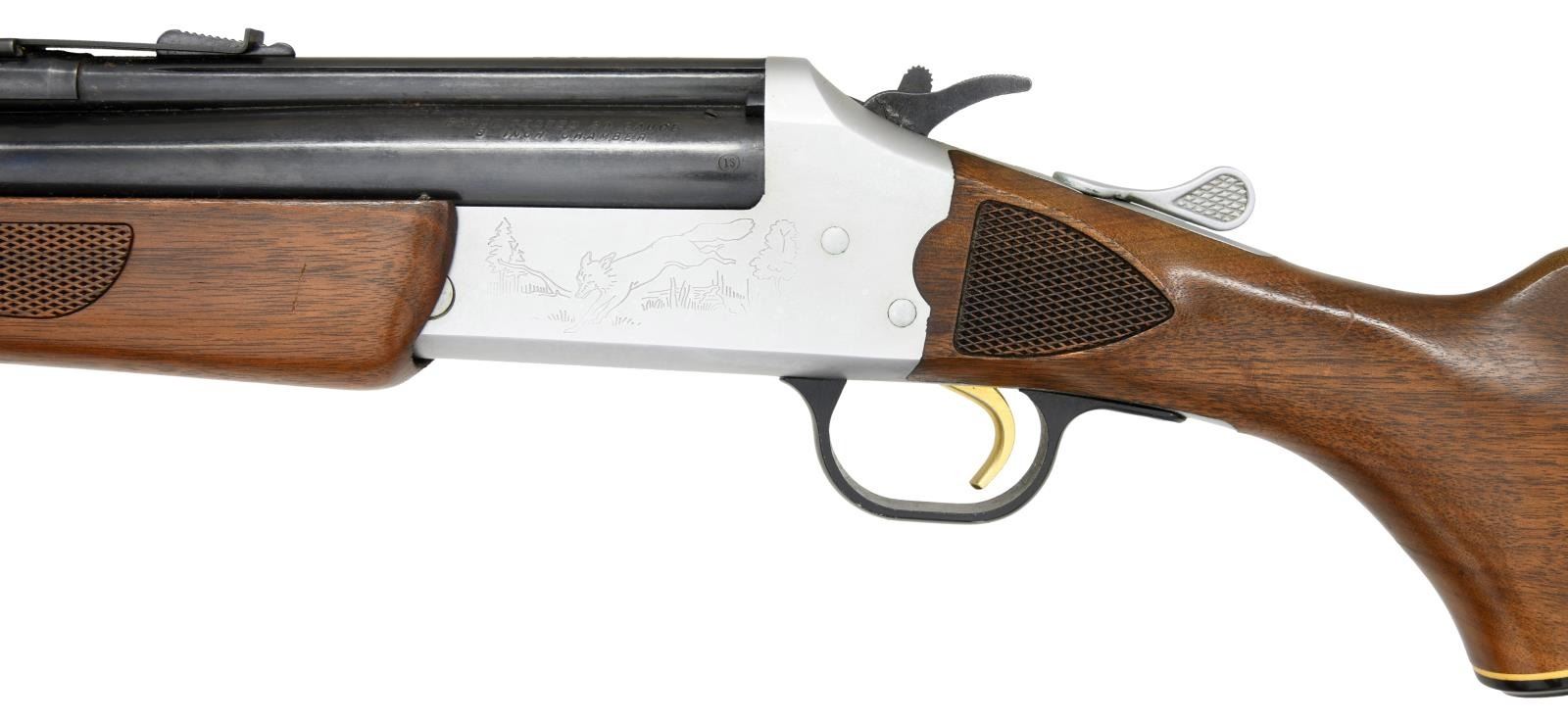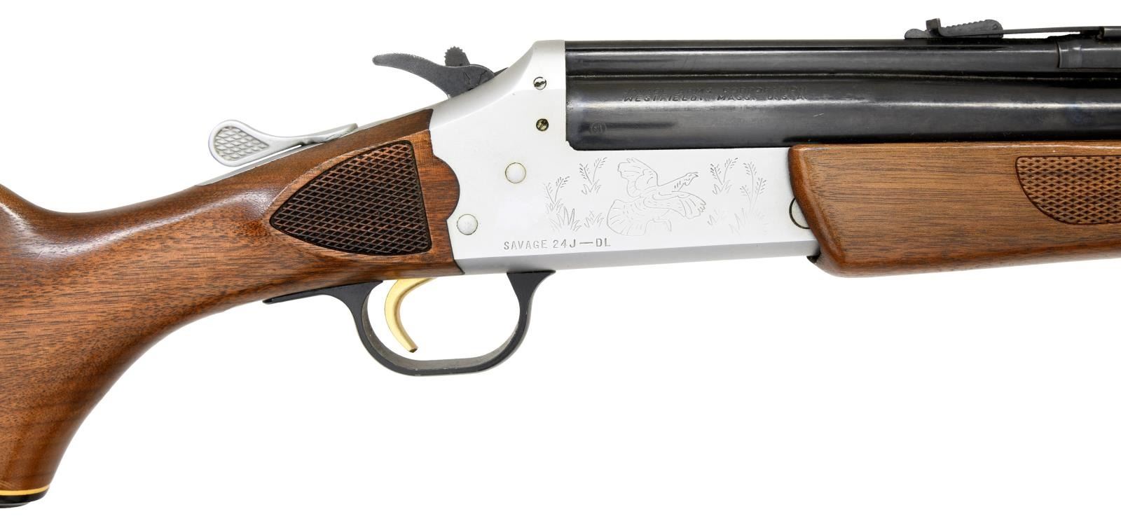Cal. 22 LR/20 Ga. NSN. Bbl. 24". 3” Chamber & fixed IM choke. Fixed ramp front & elevation adjustable rear sights. Blued Bbls., satin finished game scene engraved frame, black trigger guard & gold colored trigger. Checkered forend & ebony capped pistol grip buttstock. CONDITION: 95% original blue & light wear on frame. Stock set has light scattered scratches & a shallow gouge left side buttstock. Bores are very good, bright & strong. (23-1135/CW). CURIO. $300-500.