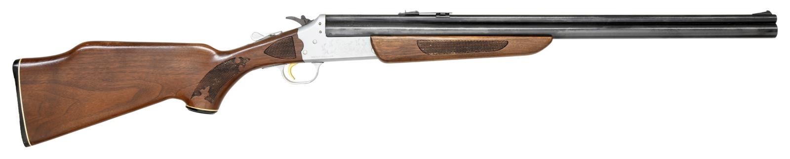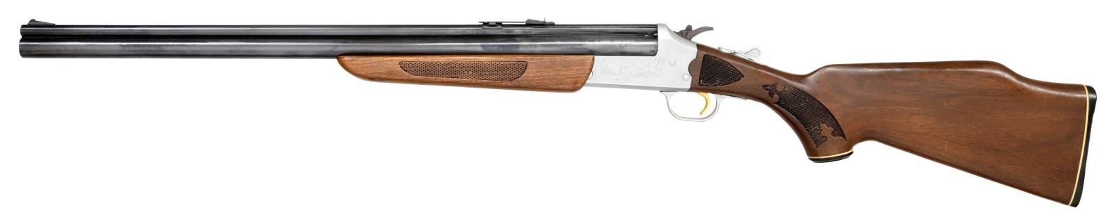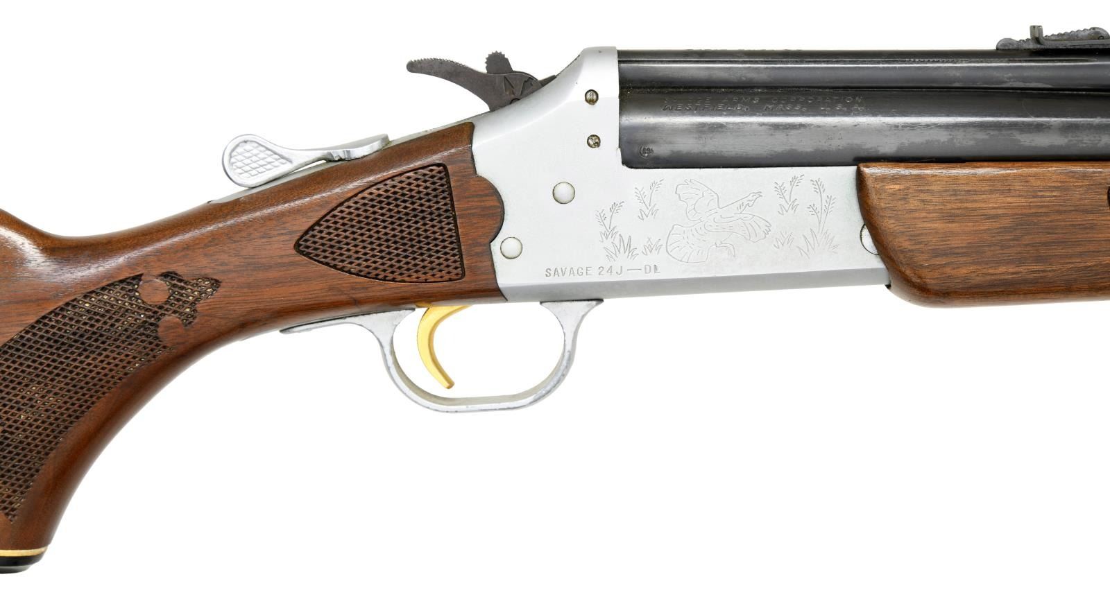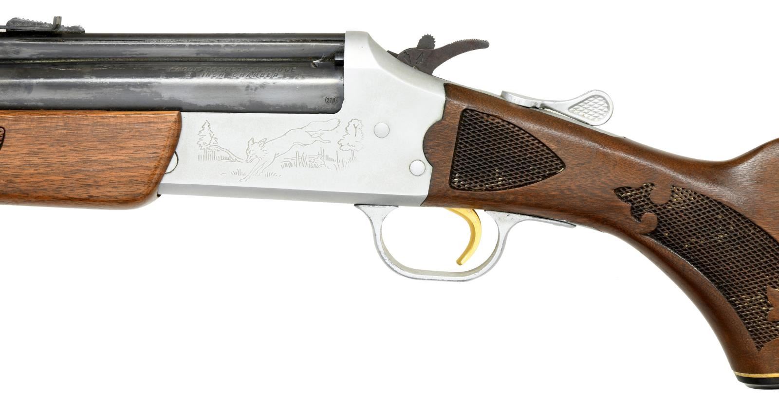 Cal. 22 LR/20 Ga. NSN. Bbl. 24". 3” chamber & choked “FULL”. Fixed ramp front & elevation adjustable rear sights. Blued Bbl., satin finished game scene engraved frame & gold colored trigger. Checkered forend & ebony capped pistol grip buttstock. CONDITION: 80% blue w/ spots of light rust, frame & trigger guard have scratches. Stock set shows light dings & marks. Bores are good plus, fairly bright w/ strong rifling in 22 LR Bbl., & some stubborn fouling. (23-1154/CW). CURIO. $300-400.