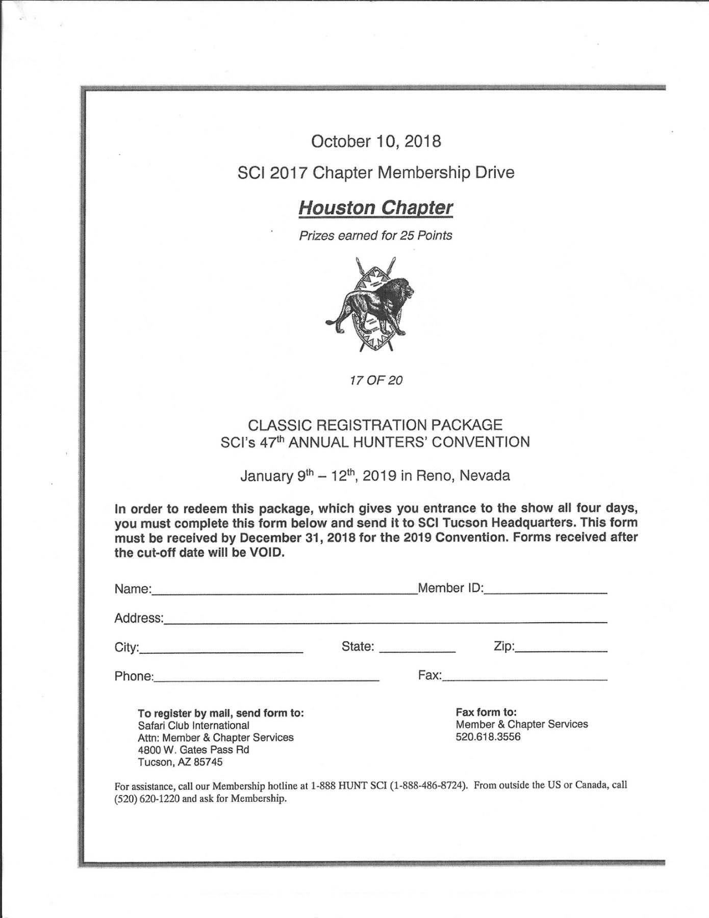 Thanks for your interest in the 2018 SCI Houston First for Hunter ... GLOBAL! Banquet & Fundraiser. We donate tens of thousands of dollars every year to SCIF programs, local, national and international conservation, humanitarian and educational efforts. And it’s all funded by our Fundraisers and your Donations.
